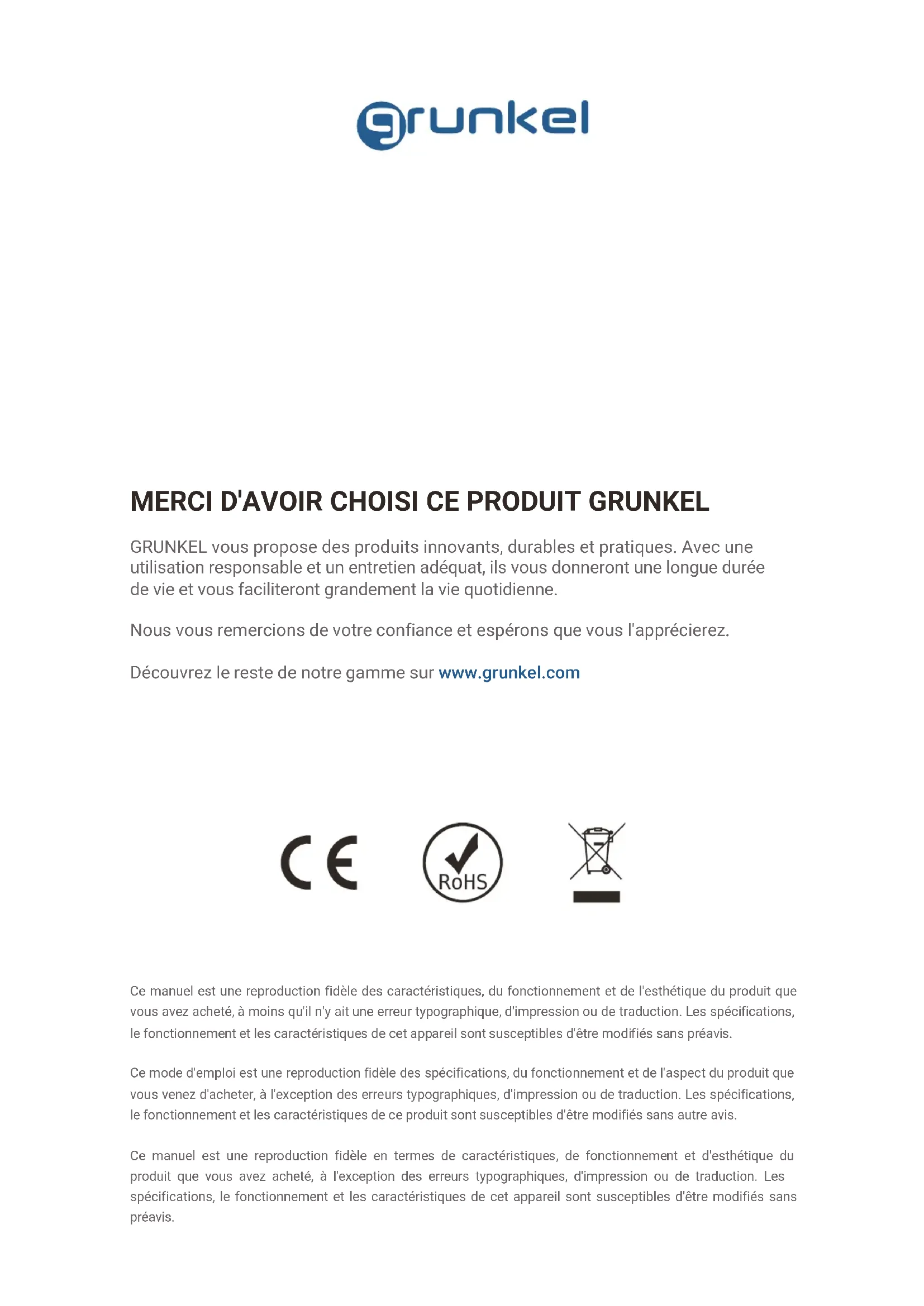 QUOTIDIENDÉCOUVREZ TOUT CE QUE NOUS POUVONS FAIRE POUR VOUS À www.grunkel.comMERCI D'AVOIR CHOISI CE PRODUIT GRUNKEL GRUNKEL vous propose des produits innovants, durables et pratiques. Avec une utilisation responsable et un entretien adéquat, ils vous donneront une longue durée de vie et vous faciliteront grandement la vie quotidienne. Nous vous remercions de votre confiance et espérons que vous l'apprécierez. Découvrez le reste de notre gamme sur www.grunkel.com