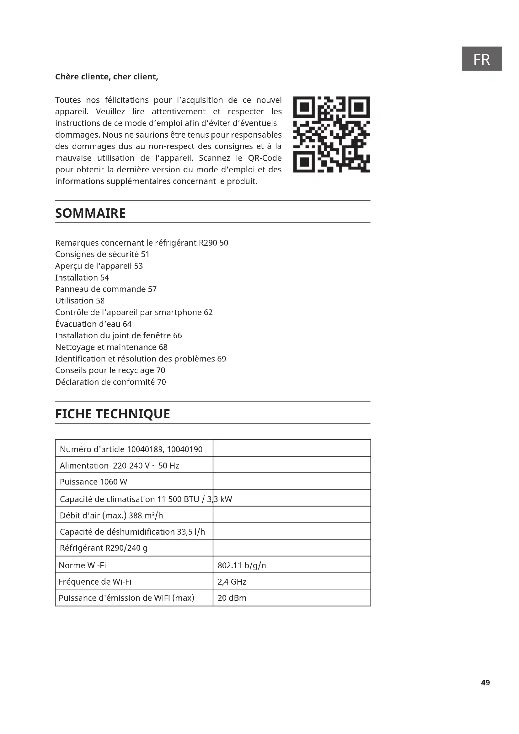 Chère cliente, cher client, Toutes nos félicitations pour l’acquisition de ce nouvel appareil. Veuillez lire attentivement et respecter les instructions de ce mode d’emploi an d’éviter d’éventuels dommages. Nous ne saurions être tenus pour responsables des dommages dus au non-respect des consignes et à la mauvaise utilisation de l’appareil. Scannez le QR-Code pour obtenir la dernière version du mode d‘emploi et des informations supplémentaires concernant le produit. SOMMAIRE Remarques concernant le réfrigérant R290 50 Consignes de sécurité 51 Aperçu de l‘appareil 53 Installation 54 Panneau de commande 57 Utilisation 58 Contrôle de l‘appareil par smartphone 62 Évacuation d‘eau 64 Installation du joint de fenêtre 66 Nettoyage et maintenance 68 Identication et résolution des problèmes 69 Conseils pour le recyclage 70 Déclaration de conformité 70 FICHE TECHNIQUE Numéro d'article 10040189, 10040190 Alimentation 220-240 V ~ 50 Hz Puissance 1060 W Capacité de climatisation 11 500 BTU / 3,3 kW Débit d'air (max.) 388 m³/h Capacité de déshumidication 33,5 l/h Réfrigérant R290/240 g Norme Wi-Fi