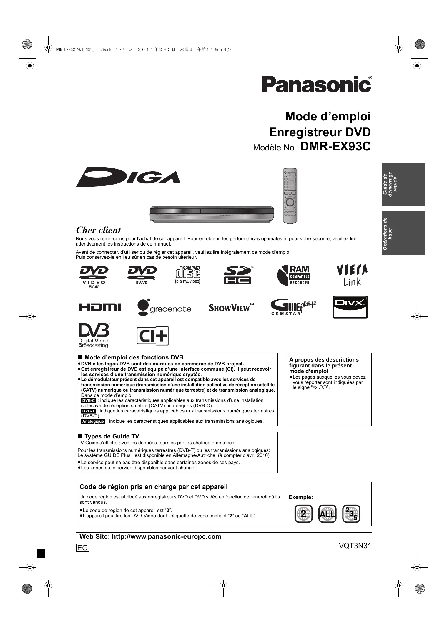 Cher client Nous vous remercions pour l’achat de cet appareil. Pour en obtenir les performances optimales et pour votre sécurité, veuillez lire attentivement les instructions de ce manuel. Avant de connecter, d’utiliser ou de régler cet appareil, veuillez lire intégralement ce mode d’emploi. Puis conservez-le en lieu sûr en cas de besoin ultérieur. ∫ Mode d’emploi des fonctions DVB ≥DVB e les logos DVB sont des marques de commerce de DVB project. ≥Cet enregistreur de DVD est équipé d’une interface commune (CI). Il peut recevoir les services d’une transmission numérique cryptée. ≥Le démodulateur présent dans cet appareil est compatible avec les services de transmission numérique (transmission d’une installation collective de réception satellite (CATV) numérique ou transmission numérique terrestre) et de transmission analogique. Dans ce mode d’emploi, [DVB-C] : indique les caractéristiques applicables aux transmissions d’une installation collective de réception satellite (CATV) numériques (DVB-C). [DVB-T] : indique les caractéristiques applicables aux transmissions numériques terrestres (DVB-T). [Analogique] : indique les caractéristiques applicables aux transmissions analogiques. À propos des descriptions figurant dans le présent mode d’emploi ≥Les pages auxquelles vous devez vous reporter sont indiquées par le signe “> ±±”. ∫ Types de Guide TV TV Guide s’affiche avec les données fournies par les chaînes émettrices. Pour les transmissions numériques terrestres (DVB-T) ou les transmissions analogiques: Le système GUIDE Plus+ est disponible en Allemagne/Autriche. (à compter d’avril 2010) ≥Le service peut ne pas être disponible dans certaines zones de ces pays. ≥Les zones ou le service disponibles peuvent changer. Code de région pris en charge par cet appareil Un code région est attribué aux enregistreurs DVD et DVD vidéo en fonction de l’endroit où ils sont vendus. ≥Le code de région de cet appareil est “2”. ≥L’appareil peut lire les DVD-Vidéo dont l’étiquette de zone contient “2” ou “ALL”. Exemple: