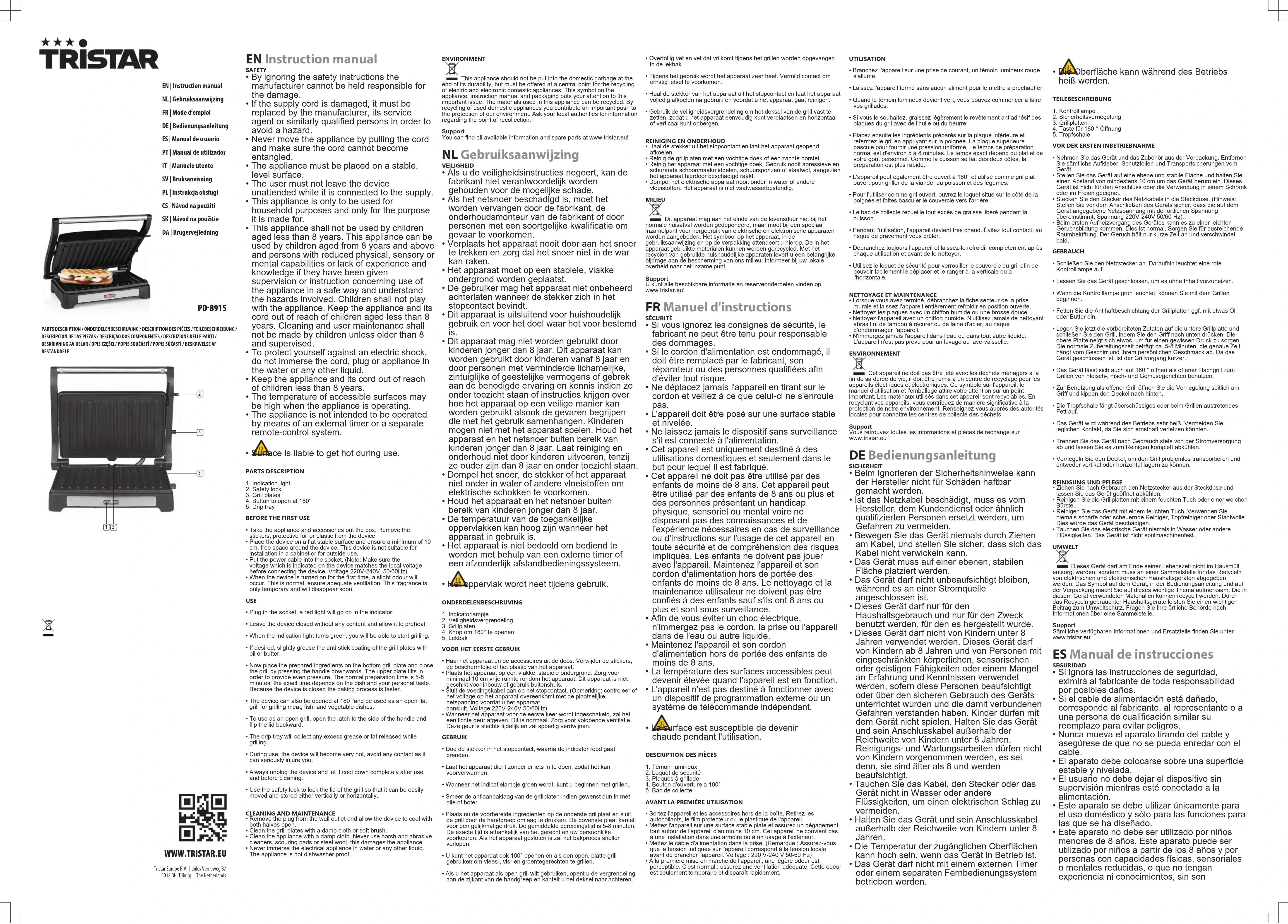 - La surface est susceptible de devenir chaude pendant l'utilisation. DESCRIPTION DES PIÈCES1. Témoin lumineux2. Loquet de sécurité3. Plaques à grillade4. Bouton d'ouverture à 180°5. Bac de collecteAVANT LA PREMIÈRE UTILISATION• Sortez l'appareil et les accessoires hors de la boîte.Retirez lesautocollants, le film protecteur ou le plastique de l'appareil.• Mettez l'appareil sur une surface stable plate et assurez un dégagementtout autour de l'appareil d'au moins 10 cm. Cet appareil ne convient pasà une installation dans une armoire ou à un usage à l'extérieur.• Mettez le câble d'alimentation dans la prise.(Remarque : Assurez-vousque la tension indiquée sur l'appareil correspond à la tension localeavant de brancher l'appareil.Voltage : 220 V-240 V 50-60 Hz)• À la première mise en marche de l'appareil, une légère odeur estperceptible. C'est normal : assurez une ventilation adéquate. Cette odeurest seulement temporaire et disparaît rapidement.UTILISATION• Branchez l'appareil sur une prise de courant, un témoin lumineux rouges'allume.• Laissez l'appareil fermé sans aucun aliment pour le mettre à préchauffer.• Quand le témoin lumineux devient vert, vous pouvez commencer à fairevos grillades.• Si vous le souhaitez, graissez légèrement le revêtement antiadhésif desplaques du gril avec de l'huile ou du beurre.• Placez ensuite les ingrédients préparés sur la plaque inférieure etrefermez le gril en appuyant sur la poignée. La plaque supérieurebascule pour fournir une pression uniforme. Le temps de préparationnormal est d'environ 5 à 8 minutes. Le temps exact dépend du plat et devotre goût personnel. Comme la cuisson se fait des deux côtés, lapréparation est plus rapide.• L'appareil peut également être ouvert à 180° et utilisé comme gril platouvert pour griller de la viande, du poisson et des légumes.• Pour l'utiliser comme gril ouvert, ouvrez le loquet situé sur le côté de lapoignée et faites basculer le couvercle vers l'arrière.• Le bac de collecte recueille tout excès de graisse libéré pendant lacuisson.• Pendant l'utilisation, l'appareil devient très chaud. Évitez tout contact, aurisque de gravement vous brûler.• Débranchez toujours l'appareil et laissez-le refroidir complètement aprèschaque utilisation et avant de le nettoyer.• Utilisez le loquet de sécurité pour verrouiller le couvercle du gril afin depouvoir facilement le déplacer et le ranger à la verticale ou àl'horizontale.NETTOYAGE ET MAINTENANCE• Lorsque vous avez terminé, débranchez la fiche secteur de la prisemurale et laissez l'appareil entièrement refroidir en position ouverte.• Nettoyez les plaques avec un chiffon humide ou une brosse douce.• Nettoyez l'appareil avec un chiffon humide. N'utilisez jamais de nettoyantabrasif ni de tampon à récurer ou de laine d'acier, au risqued'endommager l'appareil.• N'immergez jamais l'appareil dans l'eau ou dans tout autre liquide.L'appareil n'est pas prévu pour un lavage au lave-vaisselle.ENVIRONNEMENTCet appareil ne doit pas être jeté avec les déchets ménagers à lafin de sa durée de vie, il doit être remis à un centre de recyclage pour lesappareils électriques et électroniques. Ce symbole sur l'appareil, lemanuel d'utilisation et l'emballage attire votre attention sur un pointimportant. Les matériaux utilisés dans cet appareil sont recyclables. Enrecyclant vos appareils, vous contribuez de manière significative à laprotection de notre environnement. Renseignez-vous auprès des autoritéslocales pour connaître les centres de collecte des déchets.SupportVous retrouvez toutes les informations et pièces de rechange surwww.tristar.eu! DEBedienungsanleitung SICHERHEIT