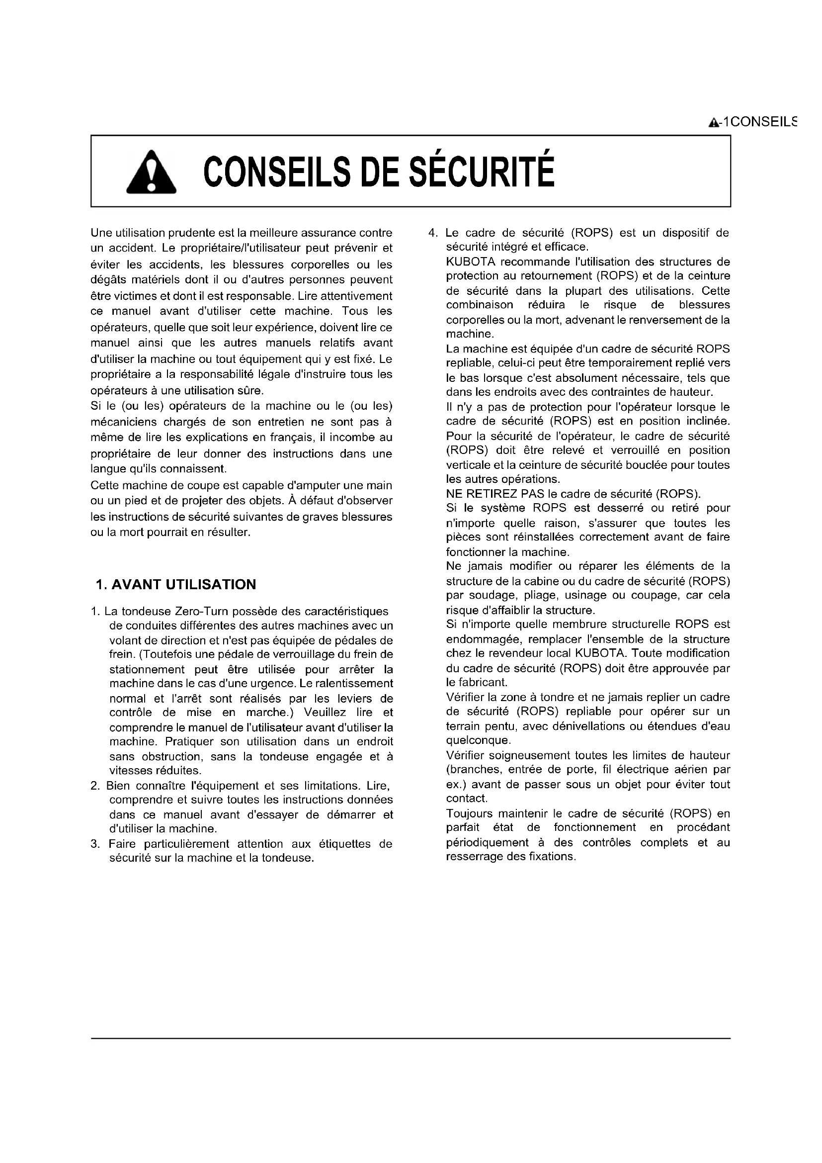 ATTENTION : Indique une situation éminemment dangereuse, des blessures graves ou la mort peuvent survenir si cette situation n'est pas évitée. Indique une situation potentiellement dangereuse, des blessures graves ou la mort peuvent survenir si cette situation n'est pas évitée. Indique une situation potentiellement dangereuse, des blessures mineures ou graves peuvent survenir si cette situation n'est pas évitée. Si les instructions se sont pas suivies des dommages à l'équipement ou à la propriété peuvent survenir. Donne des informations pertinentes. Ce symbole est celui utilisé dans l'industrie pour indiquer un danger. Il est utilisé pour attirer votre attention sur des éléments ou des opérations qui pourraient être dangereux pour vous-mêmes ou d'autres utilisateurs de cette machine. Lisez donc attentivement les consignes qu'il signale. Il est essentiel que vous lisiez les instructions et les réglementations de sécurité avant d'entreprendre l'assemblage ou l'utilisation de cette machine. AVANT-PROPOS Vous êtes maintenant l'heureux propriétaire d'une TONDEUSE ''ZERO TURN'' KUBOTA. Cette machine est le produit de l'étude et de la fabrication de haute qualité KUBOTA. Elle est fabriquée avec les meilleurs matériaux et sous un système de contrôle de qualité très rigoureux, et vous donnera de longues années de service satisfaisant. Pour tirer le meilleur parti de votre machine KUBOTA, lisez attentivement ce manuel. Il vous aidera à vous familiariser avec son fonctionnement et vous y trouverez de nombreux conseils sur l'entretien de la machine. Chez KUBOTA, nous avons pour principe d'appliquer, aussitôt que possible, tous les progrès réalisés grâce à notre recherche. La mise en œuvre immédiate de nouvelles techniques dans la fabrication de certains produits pourra faire que de petites parties de ce manuel soient périmées. Les distributeurs et concessionnaires KUBOTA disposeront cependant des informations les plus récentes. N'hésitez pas à les consulter.CONTENU