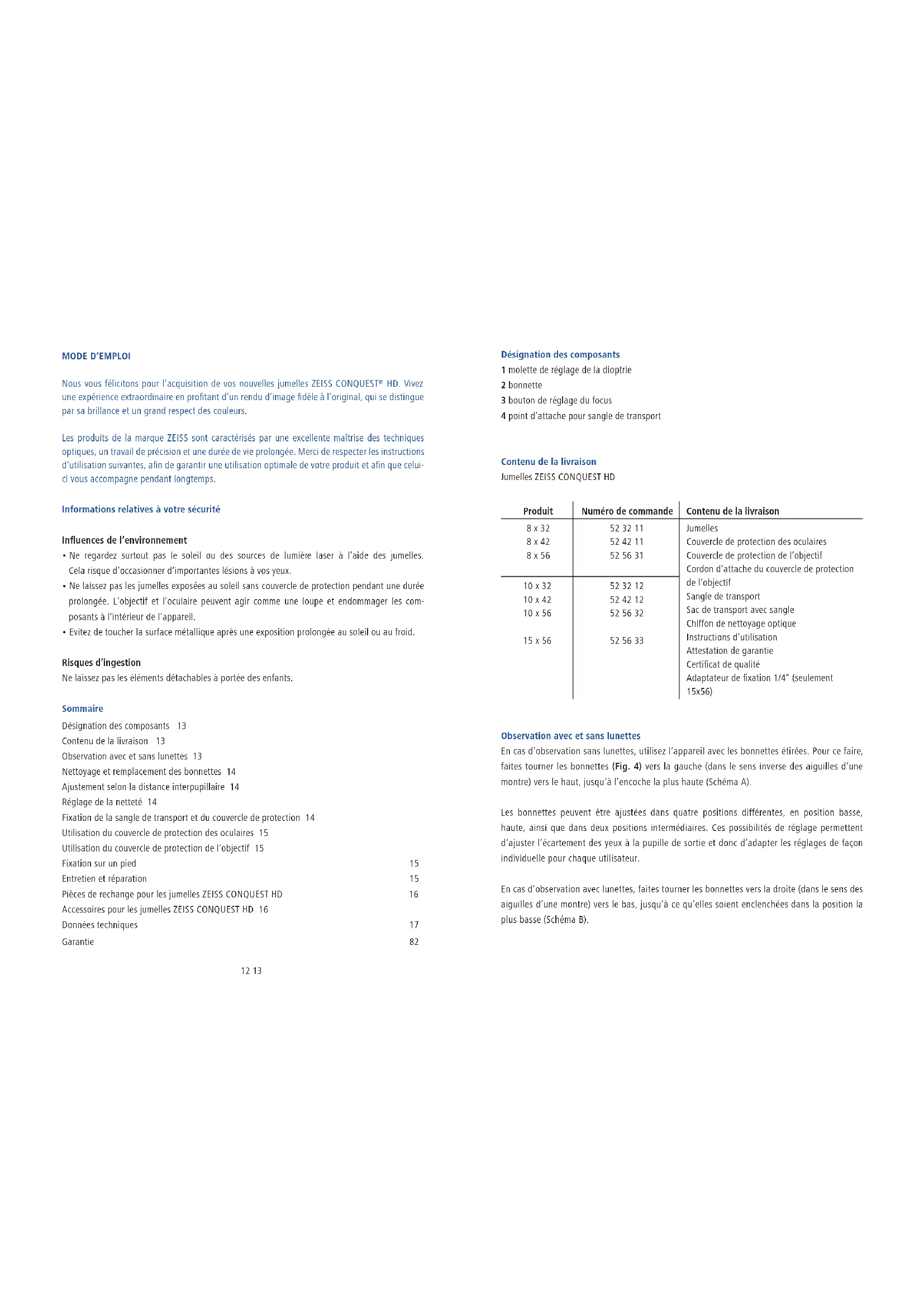 HD. Vivez une expérience extraordinaire en profitant d’un rendu d’image fidèle à l’original, qui se distingue par sa brillance et un grand respect des couleurs. Les produits de la marque ZEISS sont caractérisés par une excellente maîtrise des techniques optiques, un travail de précision et une durée de vie prolongée. Merci de respecter les instructions d’utilisation suivantes, afin de garantir une utilisation optimale de votre produit et afin que celui- ci vous accompagne pendant longtemps. Informations relatives à votre sécurité Influences de l’environnement Ne regardez surtout pas le soleil ou des sources de lumière laser à l’aide des jumelles. Cela risque d’occasionner d’importantes lésions à vos yeux. Ne laissez pas les jumelles exposées au soleil sans couvercle de protection pendant une durée prolongée. L’objectif et l’oculaire peuvent agir comme une loupe et endommager les com- posants à l’intérieur de l’appareil. Evitez de toucher la surface métallique après une exposition prolongée au soleil ou au froid. Risques d’ingestion Ne laissez pas les éléments détachables à portée des enfants. Sommaire Désignation des composants 13 Contenu de la livraison 13 Observation avec et sans lunettes 13 Nettoyage et remplacement des bonnettes 14 Ajustement selon la distance interpupillaire 14 Réglage de la netteté 14 Fixation de la sangle de transport et du couvercle de protection 14 Utilisation du couvercle de protection des oculaires 15 Utilisation du couvercle de protection de l’objectif 15 Fixation sur un pied 15 Entretien et réparation 15 Pièces de rechange pour les jumelles ZEISS CONQUEST HD 16 Accessoires pour les jumelles ZEISS CONQUEST HD 16 Données techniques 17 Garantie 82 Désignation des composants 1 molette de réglage de la dioptrie 2 bonnette 3 bouton de réglage du focus 4 point d’attache pour sangle de transport Contenu de la livraison Jumelles ZEISS CONQUEST HD Produit Numéro de commande Contenu de la livraison 8 x 32 8 x 42 8 x 56