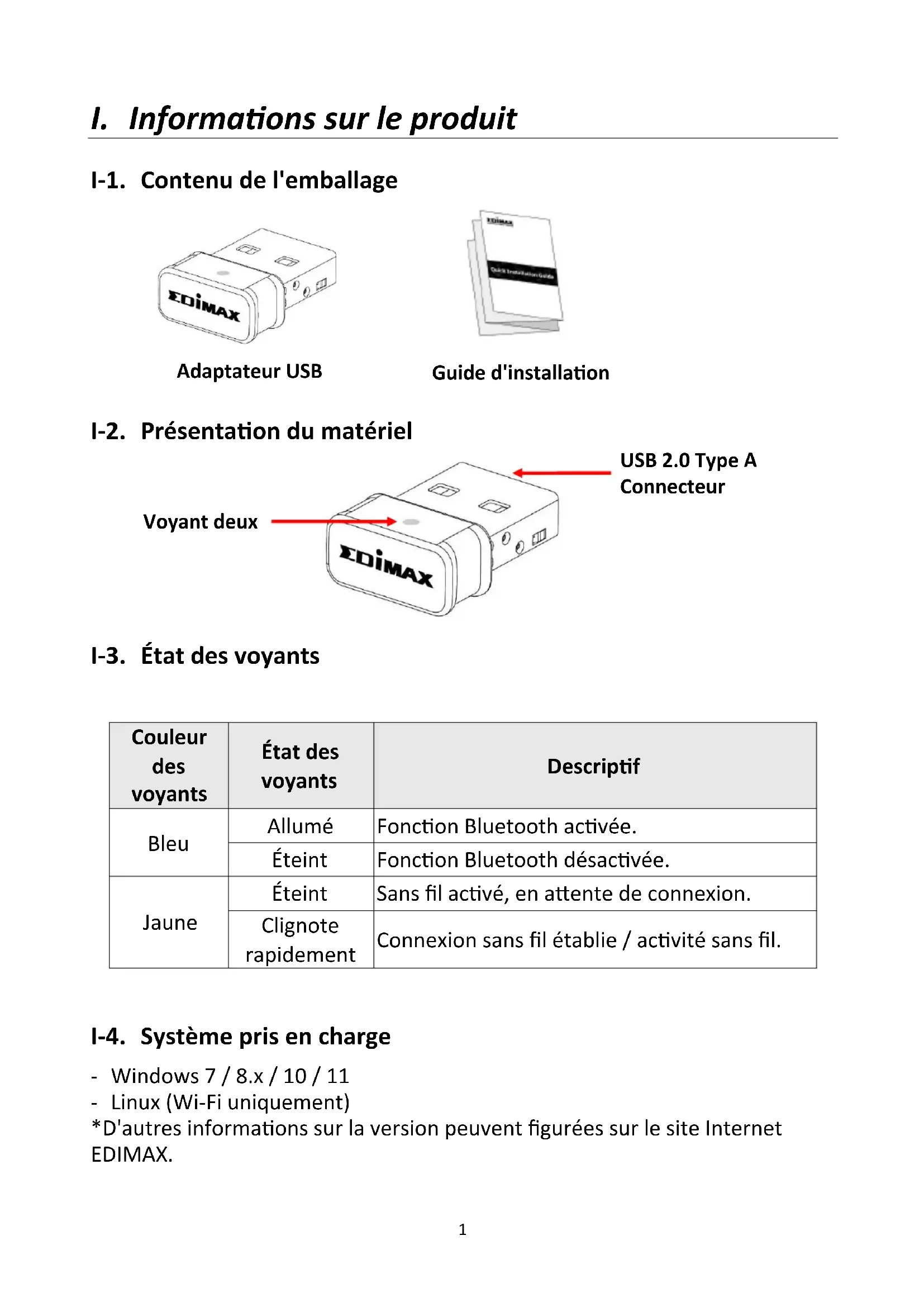 I-4. Système pris en charge - Windows 7 / 8.x / 10 / 11 - Linux (Wi-Fi uniquement) *D'autres informations sur la version peuvent figurées sur le site Internet EDIMAX. Guide d'installation rapide Adaptateur USB Voyant deux couleurs USB 2.0 Type A Connecteur2