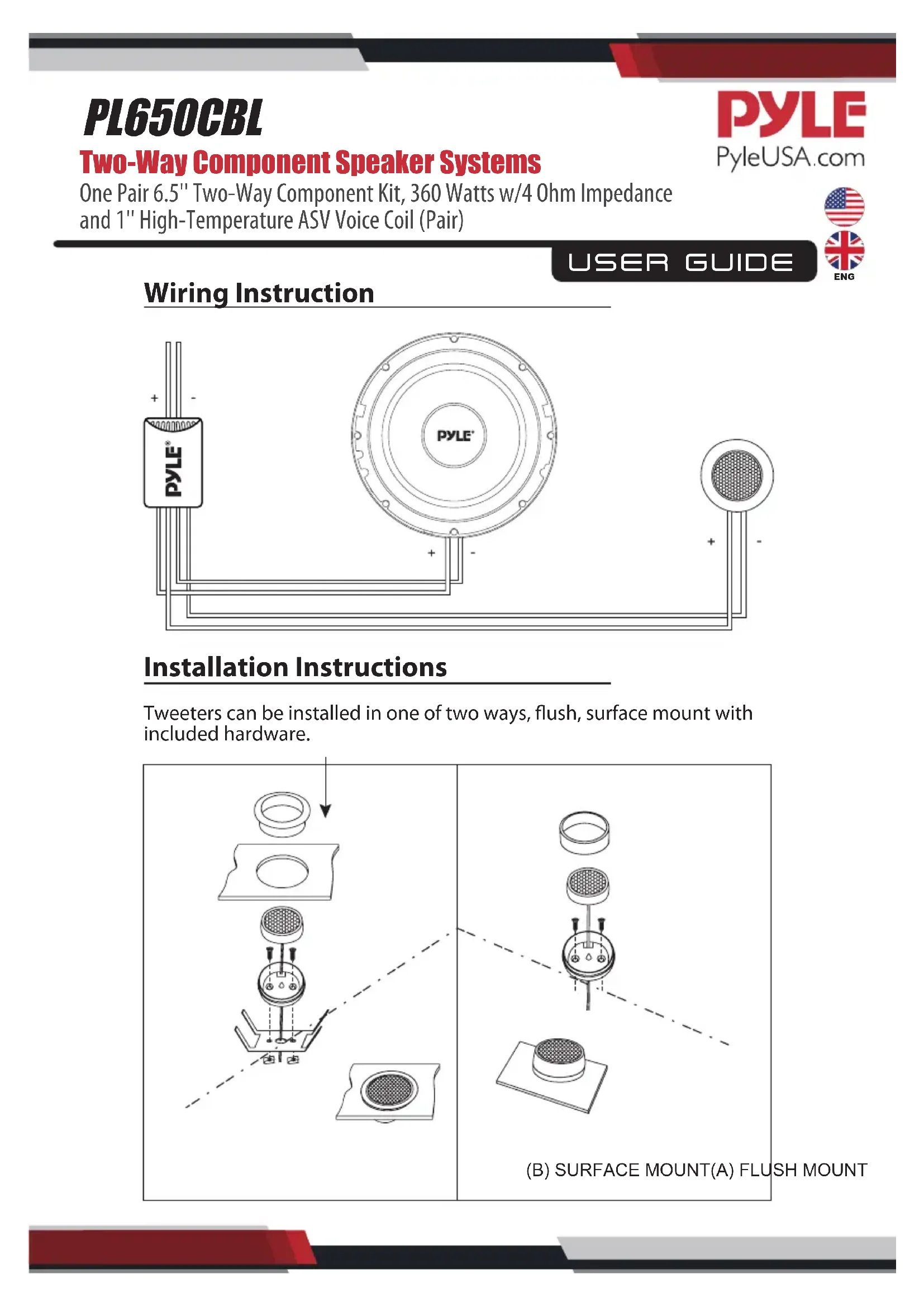 Este producto puede exponerlo a un químico o grupo de químicos que pueden incluir Di (2 ethiexil) ftalato (DEHP) que en el estado de California se reconoce como un agente que causa cáncer, defectos de nacimiento u otros problemas reproductivos. Para más información visite: www.P65warnings.ca.govADVERTENCIA:GUIDE DE L'UTILISATEUR FRE Systèmes d'enceintes à composantes à deux voies PL650CBL Kit d'enceintes à deux voies 6,5", 360 Watts avec impédance de 4 ohms et bobine mobile ASV haute température de 1" (paire) Instructions d'installation Instructions de câblage Les tweeters peuvent être installés de l'une des deux manières suivantes : en saillie ou en surface, à l'aide du matériel fourni.(B) MONTAGE EN SURFACE(A) MONTAGE ENCASTRÉDes questions? Des commentaires?Nous sommes là pour vous aider! Phone: 1.718.535.1800 PyleUSA.com/ContactUs MODÈLE