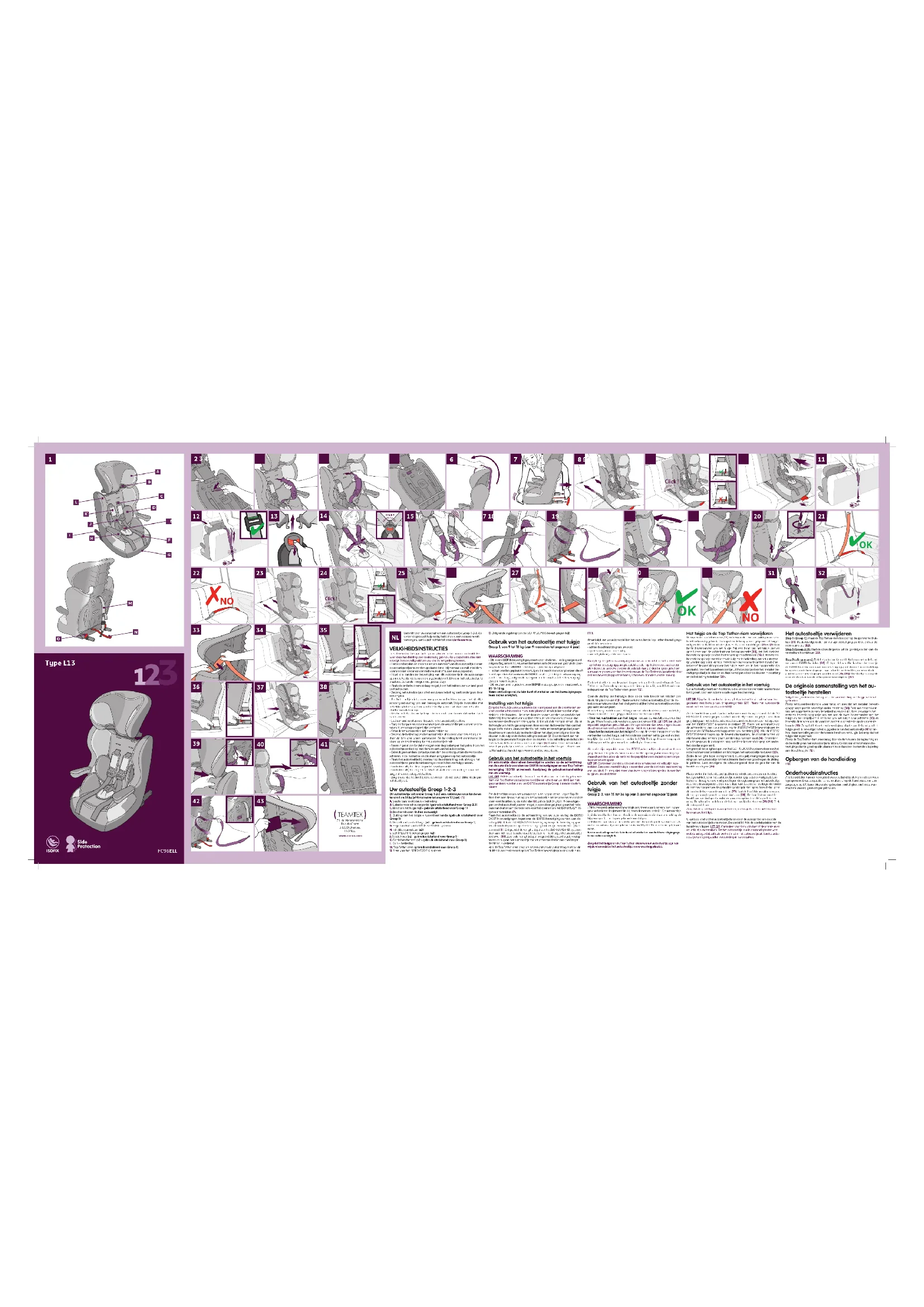 - Adaptable uniquement sur les véhicules munis de ceintures de sécurité à 3 points d’ancrage, xes ou avec enrou- leurs, homologuées selon le règlement UN/ECE N°16 ou autre norme équivalente. En cas d’incertitude, contacter le fabricant du dispositif de retenue, ou votre revendeur. Assurez-vous que le harnais et que la sangle Top Tether de votre siège auto sont démontés avant de com- mencer l’installation dans votre véhicule. Démontage du harnais et de la sangle Top-Tether Démontez la sangle Top-Tether (17) et conservez-la soigneusement pour d’éventuels futurs besoins. Appuyez sur le bouton rouge de la boucle pour déverrouiller les harnais si nécessaire. Répétez les opérations (2) et (3) sur cha- que brin supérieur des harnais. Saisissez un brin de harnais et faites-le passer à l’arrière du dossier (18), attachez la butée métallique du harnais au dossier du siège par l’arrière (19). La butée métallique doit prendre place entre la coque et la housse du siège auto. Répétez l’opération sur le second brin de harnais. Vériez que les connecteurs des harnais soient également passés derrière le dossier. Retirez la sangle d’entrejambe en faisant pivoter la butée métallique puis en la passant à travers les fentes de l’assise et de la housse (20). Installation du siège et de l’enfant dans le véhicule Votre siège auto est équipé d’un appuie-tête réglable conçu pour accompagner votre enfant tout au long de sa croissance en lui apportant une protection latérale maximum. ATTENTION: en conguration sans harnais, votre siège auto doit uniquement être installé à l’aide de ceintures de sécurité 3 points d’ancrage (21), n’installez jamais votre siège auto avec une ceinture 2 points d’ancrage (22) ! Relevez l’appuie-tête réglable du siège auto au maximum. Déployez au maximum les connecteurs ISOFIX/EASYFIX du siège auto en tirant simultanément sur la poignée rouge de la base et sur la sangle rouge de déploiement du système ISOFIX/EASYFIX (7). Placez le siège auto sur la banquette du véhicule et présentez les connecteurs ISOFIX/ EASYFIX face aux points d’ancrage ISOFIX de la banquette (23). Cliquez les connecteurs ISOFIX/EASYFIX sur les points d’ancrage, les témoins présents sur chaque connecteur doivent passer du rouge au vert (24). Assurez-vous que la boucle de la ceinture du véhicule reste accessible et qu’elle n’est pas placée sous la base du siège. Déverrouillez le cran de sûreté du système ISOFIX/EASYFIX en tirant sur la poignée rouge de la base et en pous- sant légèrement le siège auto (25). Une fois le cran de sûreté déverrouillé, poussez le siège auto en exerçant une pression uniforme sur le dossier du siège jusqu’à ce que la partie arrière du siège auto soit bien plaquée contre la banquette puis faites passer le brin diagonal de la ceinture à travers le guide de l’appuie-tête (26). Asseyez votre enfant sur le siège auto. Les accoudoirs relevables permettent de faciliter son accès au siège et son installation. Assurez-vous que son dos soit bien en contact avec le dossier du siège auto. Tirez et bouclez la ceinture du véhicule. Faites passer le brin diagonal de la ceinture sous l’accoudoir opposé au guide ceinture utilisé, le brin ventral de la ceinture du véhicule passe sous les deux accoudoirs (27). Abaissez l’appuie-tête réglable et ajustez-le à la taille de votre enfant (28). Il doit être positionné de manière à bien envelopper la tête de votre enfant an de lui apporter une protection latérale maximum tout en guidant la ceinture diagonale sur son épaule sans déborder sur son cou (29) (30). Tendez la ceinture du véhicule. Assurez-vous que la ceinture soit correctement tendue, qu’elle ne soit pas vrillée et qu’elle ne se positionne pas au niveau du cou de votre enfant. Pour sortir votre enfant du siège auto, il sut de déverrouiller et de dégagez la ceinture du véhicule sur le côté du siège auto. La ceinture restera suspendue au guide ceinture de l’appuie-tête. ATTENTION: Avant chaque trajet, vériez que les accoudoirs soient en position basse. Attachez votre siège auto avec la ceinture du véhicule en toutes circonstances, même lorsque votre enfant n’est pas installé dans le siège auto. Un siège auto non-attaché peut devenir un projectile en cas de choc. Démontage du Siège Auto Etape 1 (Groupe 1): détendez la sangle Top Tether (31) puis décrochez la sangle de son point d’ancrage et rame- nez la sangle à vous (32). Etape 1 (Groupe 2/3): délogez le brin diagonal de la ceinture de sécurité du guide sangle de l’appuie-tête réglable (33). Etape 2 (tous groupes): Tirez le siège auto en actionnant la poignée rouge de la base ISOFIX (34). De chaque côté du siège, déverrouillez les connecteurs ISOFIX de leurs points d’ancrage en tirant à vous les boutons de déver- rouillage des connecteurs. Les témoins des connecteurs passent alors du vert au rouge (35) (36). Votre siège est à présent démonté et peut être retiré de la banquette (37). Revenir à la configuration originale du siège auto Suivez les instructions suivantes si vous désirez revenir à une conguration avec harnais. Réinstallez la sangle d’entrejambe, assurez-vous que la butée métallique est bien en place sous l’assise (38). Par l’avant du dossier, entre la housse et la coque, saisissez puis faites pivoter la butée métallique d’un des deux brins supérieurs des harnais et tirez simultanément ce brin de harnais par l’arrière (39). Réinstallez-le à l’avant du dossier à la hauteur désirée (40). Veillez à ce que la butée métallique du brin de harnais soit bien place derrière le dossier (41). Répétez l’opération avec le second brin de harnais. Assurez-vous que les harnais ne soient pas vrillés. Ré-installez la sangle Top Tether en la faisant cheminer entre le dossier et la housse du siège auto. Assurez-vous 