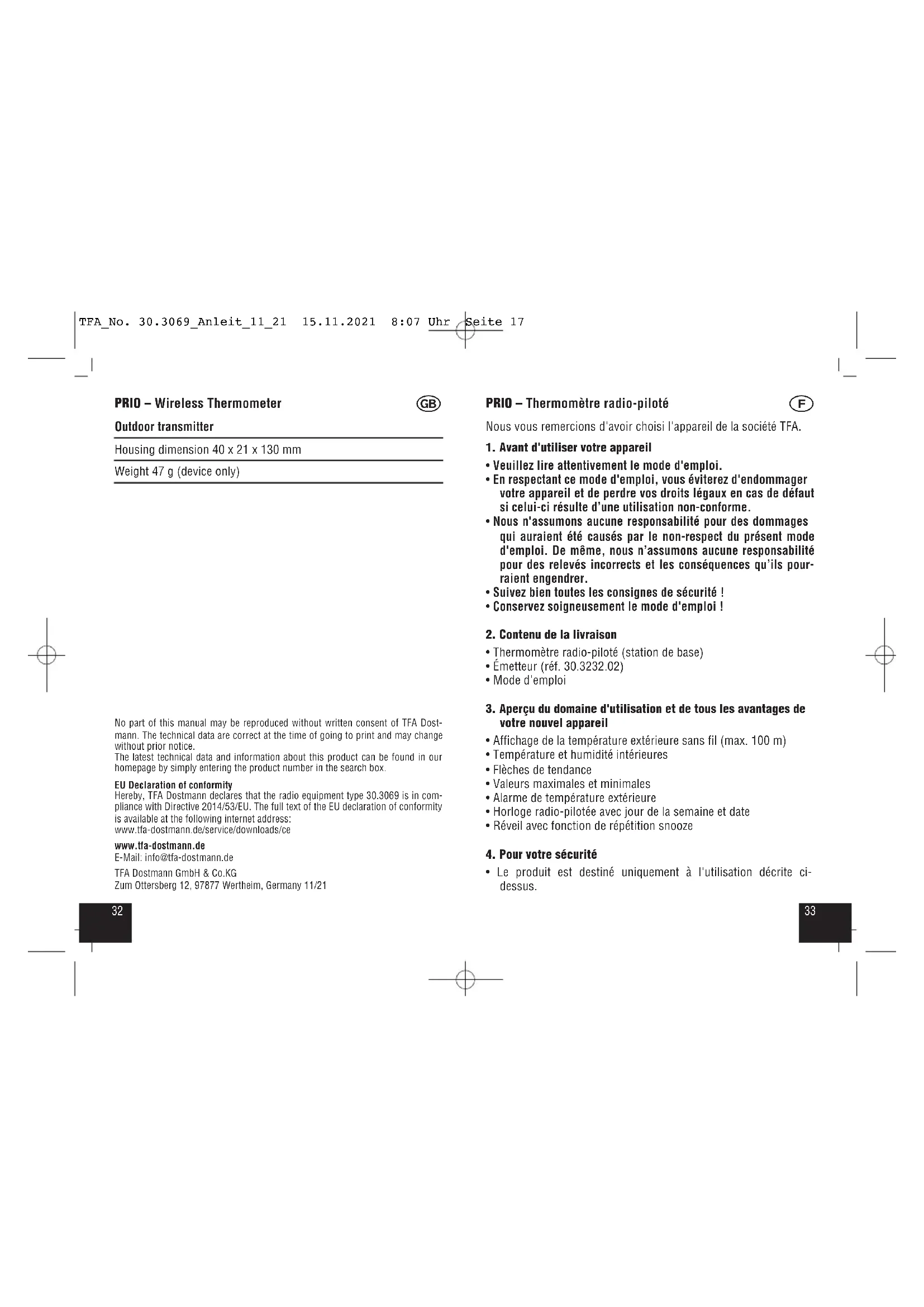 - Le produit est destiné uniquement à l'utilisation décrite ci- dessus. TFA_No. 30.3069_Anleit_11_21 15.11.2021 8:07 Uhr Seite 173534 PRIO – Thermomètre radio-piloté