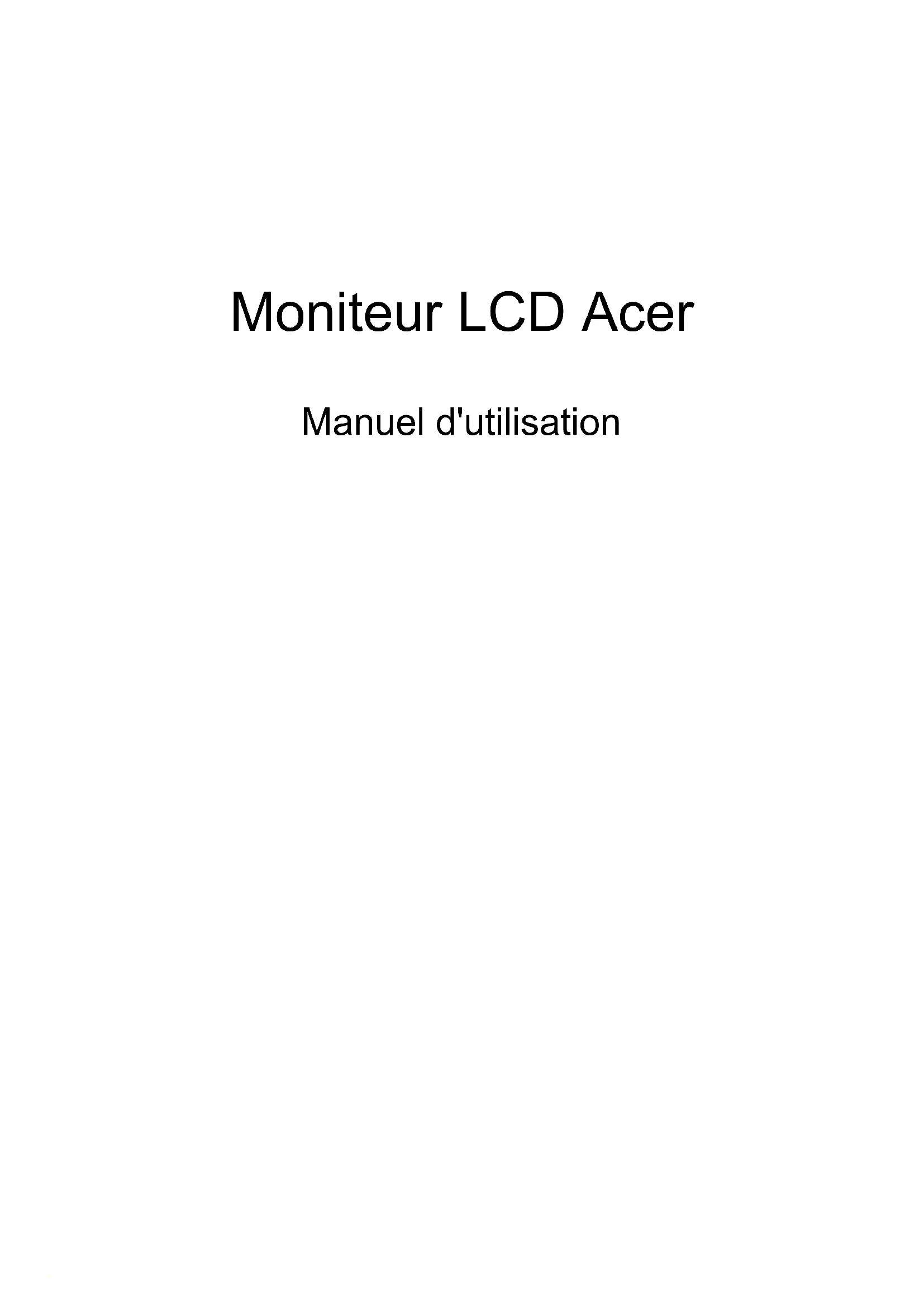 Moniteur LCD Acer Manuel d'utilisationCopyright © 2018. Acer Incorporated. Tous droits réservés. Manuel d’utilisation du Moniteur LCD Acer Première publication : 09/2018 Manuel d’utilisation du Moniteur LCD Acer Acer et le logo Acer sont des marques commerciales déposées par Acer Incorporated. Les noms de produits ou marques commerciales d'autres sociétés sont utilisés ici à des fins d'identification uniquement et sont la propriété de leurs détenteurs respectifs. Des modifications peuvent être périodiquement apportées aux informations contenues dans cette publication sans obligation de notifier quiconque de telles révisions ou modifications. Ces modifications seront intégrées aux nouvelles éditions de ce manuel ou à des documents et publications complémentaires. Cette société ne fait aucune représentation ou garantie, expresse ou implicite, en ce qui concerne le contenu de ceux-ci et déclinent expressément les garanties implicites de qualité marchande ou d’adéquation à un usage particulier. Enregistrez le numéro de série, la date d’achat et le numéro du modèle dans l’espace prévu ci-dessous. Le numéro de série et le numéro de modèle sont imprimés sur l’étiquette collée sur votre ordinateur. Toutes les correspondances concernant votre unité doivent inclure le numéro de série, le numéro de modèle et les informations d’achat. Toute reproduction, transmission, transcription ou mise en mémoire de ce manuel ou partie sur un support quelconque, par quelque procédé que ce soit, notamment, électronique, mécanique, photocopie, enregistrement, ou autre, sont interdites sans l'autorisation écrite préalable d’Acer Incorporated. Numéro de modèle : _______________________________ Numéro de série : _________________________________ Date d’achat : ____________________________________ Lieu d'achat : ____________________________________iii Français Informations pour Votre Sécurité et votre Confort Consignes de sécurité Lisez ces instructions avec attention. Conservez ce document pour des références futures. Conformez-vous aux consignes et avertissements indiqués sur cet appareil. Remarques spéciales relatives aux moniteurs LCD Il est normal que les symptômes suivant se produisent en utilisant le moniteur LCD, ils n’indiquent aucun problème.