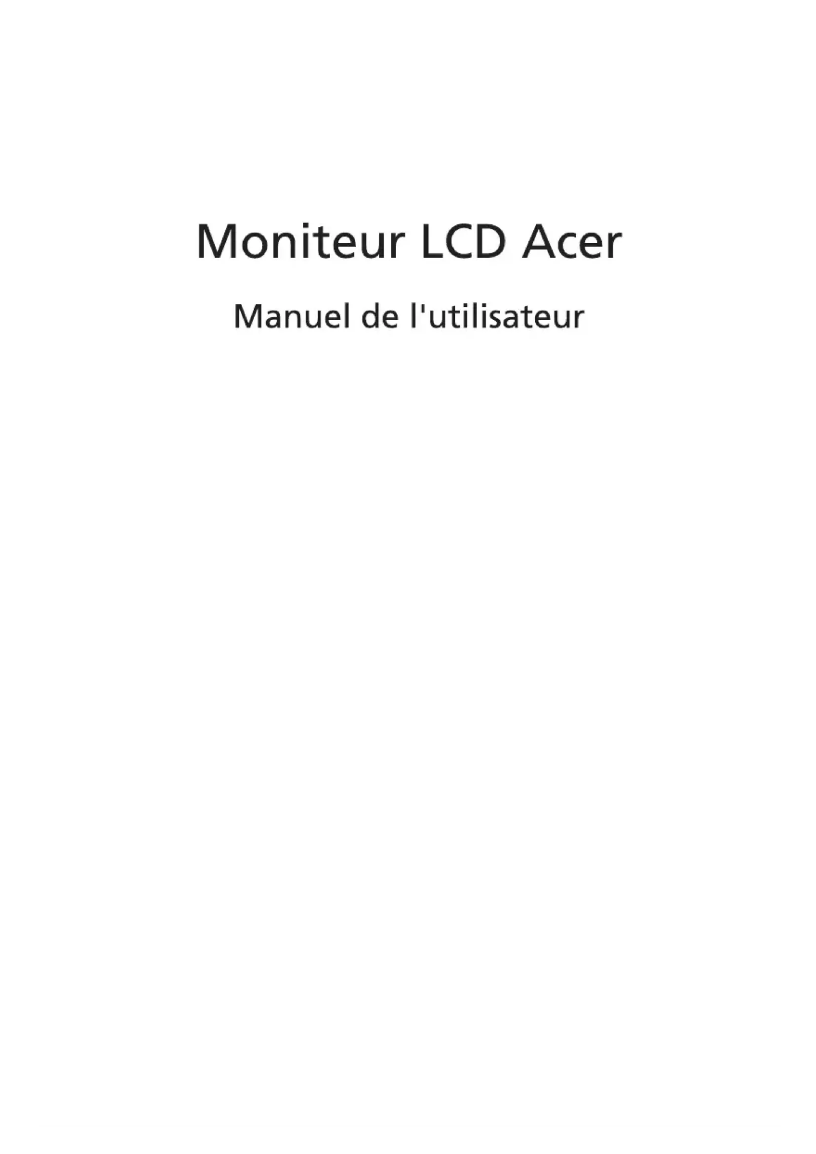 Informations concernant le recyclage des équipements TI Acer s'engage dans la protection de l'environnement et considère le recyclage, sous forme de la récupération et la mise au rebut des équipements usagés, comme l'une des principales priorités de la société, minimisant ainsi les nuisances à l'environnement. Chez Acer, nous nous soucions des effets de notre activité sur l'environnement et cherchons à identifier et à proposer les meilleures procédures de travail pour réduire l'impact environnement de nos produits. Pour plus d'informations et pour obtenir de l'aide lors du recyclage, veuillez consulter ce site Web : Visitez www.acer-group.com pour en savoir plus sur les caractéristiques et les avantages de nos autres produits. Ce symbole sur le produit ou sur son emballage indique que ce produit ne doit pas être jeté avec les autres déchets ménagers. Au lieu de cela, il est de votre responsabilité d'éliminer les déchets d'équipements en les remettant à un point de collecte désigné pour le recyclage des équipements électriques et électroniques. La collecte séparée et le recyclage des équipements usagés contribueront à la conservation des ressources naturelles et assureront leur traitement de manière écologique, protégeant ainsi la santé humaine et l'environnement. Pour plus d'informations sur les lieux de mise au rebut des équipements de recyclage usagés, veuillez contacter votre bureau local, le service d'élimination des déchets ménagers ou le magasin où vous avez acheté le produit. L'unité LCD est produite en utilisant des techniques de fabrication de haute précision. Cependant, certains pixels peuvent parfois se déformer ou apparaître sous forme de points noirs ou rouges. Cela n'a aucun effet sur l'image enregistrée et ne constitue pas un dysfonctionnement. Ce produit est livré avec la fonction de gestion de l'alimentation activée: la souris ou en appuyant sur n'importe quelle touche du clavier.4* Les éléments présentés ci-dessous ne sont qu'à titre indicatif. Le produit réel peut être différent. Moniteur LCP Guide de démarrage rapide Cordon d'alimentation CA (en option) Adaptateur secteur (en option) Câble D-Sub (en option) Câble DP (en option) Câble audio (en option) Câble HDMI (en option)Fixez la base au bras de la base du support du moniteur.Suivez ces instructions pour détacher la base du moniteur. Appuyez et dévissez le loquet avec un tournevis. Faites glisser dans le sens de la flèche, puis retirez la base du support du moniteur. Remarque: placez soigneusement le moniteur face vers le bas sur une surface stable, utilisez un chiffon doux pour éviter de rayer l'écran.RÉGLAGE DE LA POSITION DU MONITEUR Afin d'optimiser la meilleure position de visualisation, vous pouvez régler la l'inclinaison du moniteur. Veuillez consulter l'illustration ci-dessous pour avoir un exemple de la plage d'inclinaison. InclinaisonLe moniteur est basculé en mode "Economie d’énergie" par le signal de La LED clignoteFiletage Explications Rouge Vert Terre logique Bleu Masse du moniteur Surveiller la masse Données continues DDC Retour DDC Signal de synchronisation de ligne Masse rouge Signal de synchronisation de champ Terre verte Horloge continue DDC Fond bleu Filetage Explications1 640x480 60Hz 2 640x480 75Hz 3 VESA 720x400 70Hz 4 800x600 60Hz 5 800x600 75Hz 6 1024x768 60Hz 7 1024x768 75Hz 8 1280x1024 60Hz 9 1280x1024 75Hz 10 WSXGA+ 1680x1050 60Hz 11 1920x1080 60Hz 12 1920x1080 75Hz(HDMI only) UXGA VGA SVGA XGA SXGA1. Éteignez votre moniteur et débranchez le cordon d’alimentation de votre ordinateur.