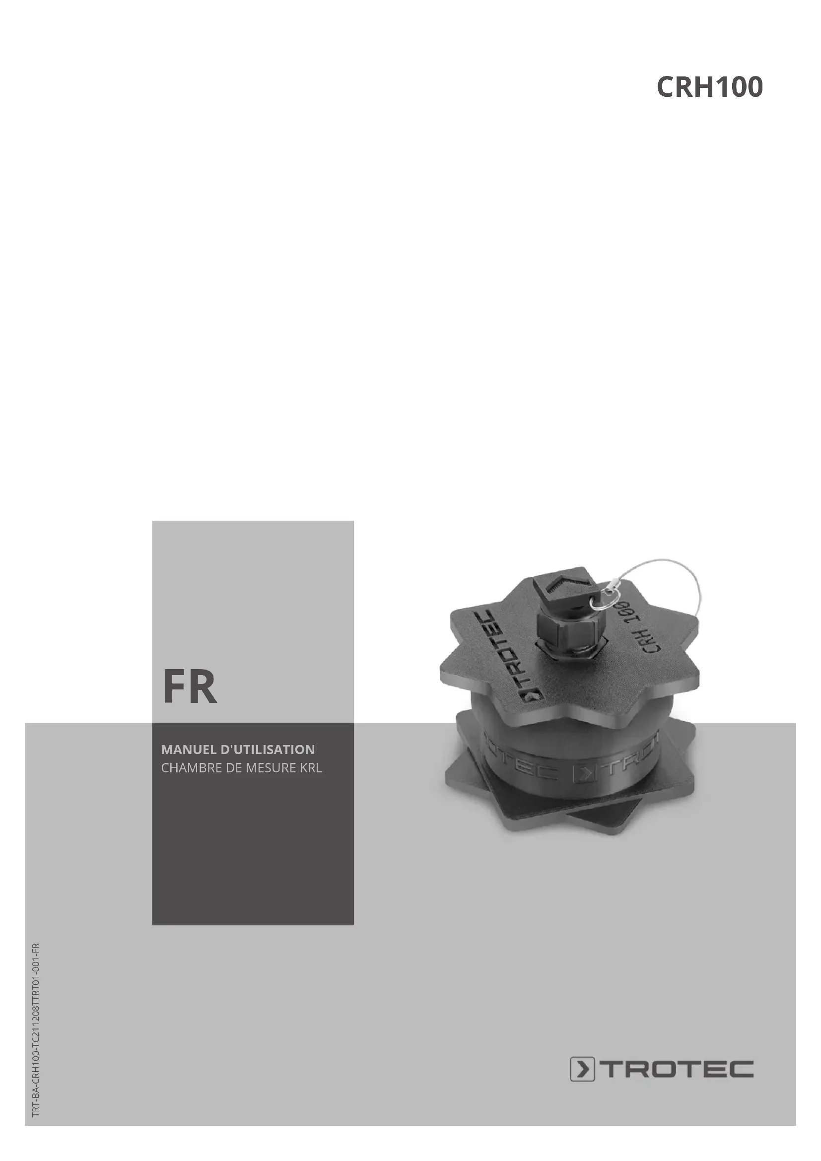 - avoir lu et compris le manuel d'utilisation de l’appareil avec lequel elle utilise cet accessoire, et notamment le chapitre concernant la sécurité. Risques résiduels Avertissement Danger de suffocation! Veuillez ne pas laisser traîner les emballages vides. Ils pourraient être dangereux pour les enfants. Avertissement Le produit n'est pas un jouet et ne doit pas être manipulé par les enfants. Avertissement L’utilisation du produit peut comporter des risques s’il est utilisé, par des personnes non instruites, de manière incorrecte ou non conforme. Observez les qualifications requises pour le personnel.FR 3 chambre de mesure KRL CRH100 Attention Tenez l'appareil à l'écart de sources de chaleur. Remarque Afin d’éviter de détériorer le produit, ne l’exposez pas à des températures ni des degrés d’humidité extrêmes et ne le mouillez pas. Remarque N'utilisez pas de nettoyants agressifs, abrasifs ni décapants pour nettoyer le produit. Informations sur le produit Description du produit En combinaison avec l’appareil de mesure multifonction T3000 et le capteur climatique TS 230 SDI, la chambre de mesure KRL CRH100 permet de mesurer l’humidité résiduelle dans les chapes minérales selon la méthode KRL et ainsi de juger de l’avancement du séchage de ces chapes. La méthode de mesure KRL La méthode de mesure KRL est une méthode de test utilisable sur les chantiers par les artisans et permettant de déterminer l’humidité relative correspondante (korrespondierende relative Luftfeuchte = KRL) des chapes minérales. L’humidité relative correspondante est l’humidité relative de l’air (en % HR) s’établissant au-dessus d’un échantillon du matériau à mesurer à l’état d’équilibre. Cette méthode de mesure a été développée avec la participation de la Commission allemande des adhésifs utilisés dans la construction (TKB) et confirmée par les experts au cours de nombreux essais circulaires. Le grand avantage de cette méthode de mesure est une indication immédiate et par principe indépendante du matériau sur le degré d’humidité des chapes minérales. Ceci rend plus sûre la détermination de l’aptitude au revêtement, en particulier pour les chapes contenant des additifs («accélérateurs de séchage»). Avec les chapes de ciment conventionnelles, toute l’eau nécessaire au traitement de la chape n’est pas absorbée au cours du processus de prise / d’hydratation. L’eau excédentaire entraîne un allongement de la durée de séchage et retarde donc l’aptitude de la chape à être revêtue. C’est cette eau excédentaire que les accélérateurs de séchage lient de façon durable sous forme cristalline, la chape pouvant ainsi être revêtue nettement plus tôt. Ces additifs peuvent toutefois être la source de déviations significatives au cours de mesures CM, d’où l’avantage, dans de tels cas, de la mesure par la méthode KRL. La chape est apte à être revêtue lorsqu’elle est capable de recevoir, sans souffrir de dommage et de manière durable, un revêtement de sol. Seuls les appareils de mesure adaptés, testés et homologués par la Commission allemande des adhésifs utilisés dans la construction (TKB) pour la mise en œuvre avec la méthode de mesure KRL, doivent être utilisés pour mesurer l’humidité relative selon la méthode KRL. Représentation du produit