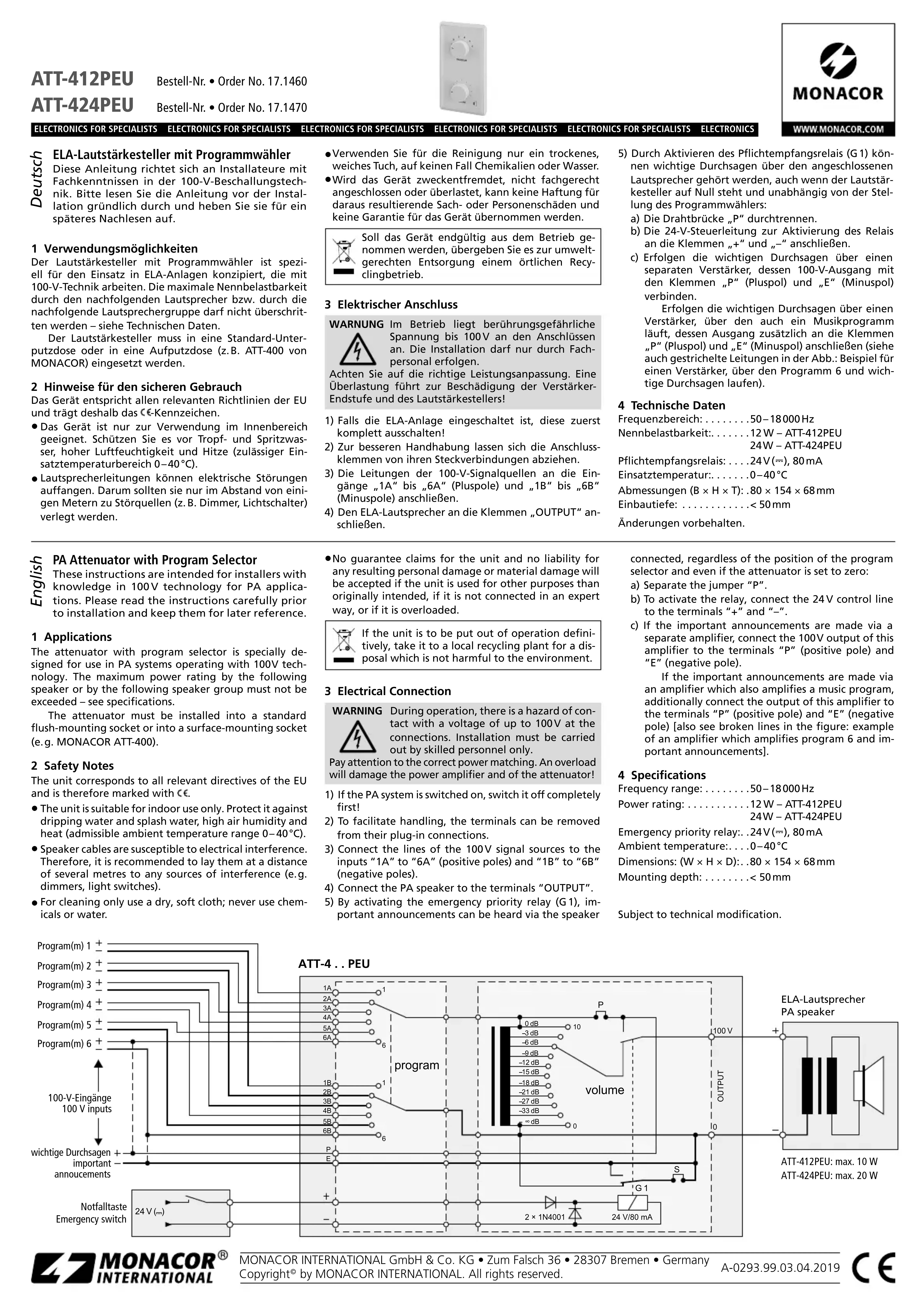 Relè prioritario: . . . . . . . . .24 V (⎓), 80 mA Temperatura d’esercizio: . .0 – 40 °C Dimensioni (l × h × p): . . . .80 × 154 × 68 mm Profondità di montaggio: .< 50 mm Con riserva di modifiche tecniche. Atténuateur Public Adress avec sélecteur de programme Cette notice s’adresse aux installateurs possédant des connaissances en technique de sonorisation ligne 100 V. Veuillez lire la présente notice avec attention avant l‘installation et conservez-la pour pouvoir vous y reporter ultérieurement. 1 Possibilités d’utilisation L’atténuateur avec sélecteur de programme est spécia- lement conçu pour une utilisation dans les systèmes de Public Adress avec technique ligne 100 V. La puissance no- minale maximale par le haut-parleur suivant ou le groupe de haut-parleurs suivants ne doit pas être dépassée : voir caractéristiques techniques. L’atténuateur doit être placé dans une prise standard encastrée ou dans une prise en saillie (p. ex. ATT-400 de MONACOR). 2 Conseils d’utilisation et de sécurité L’appareil répond à toutes les directives nécessaires de l’Union européenne et porte donc le symbole
