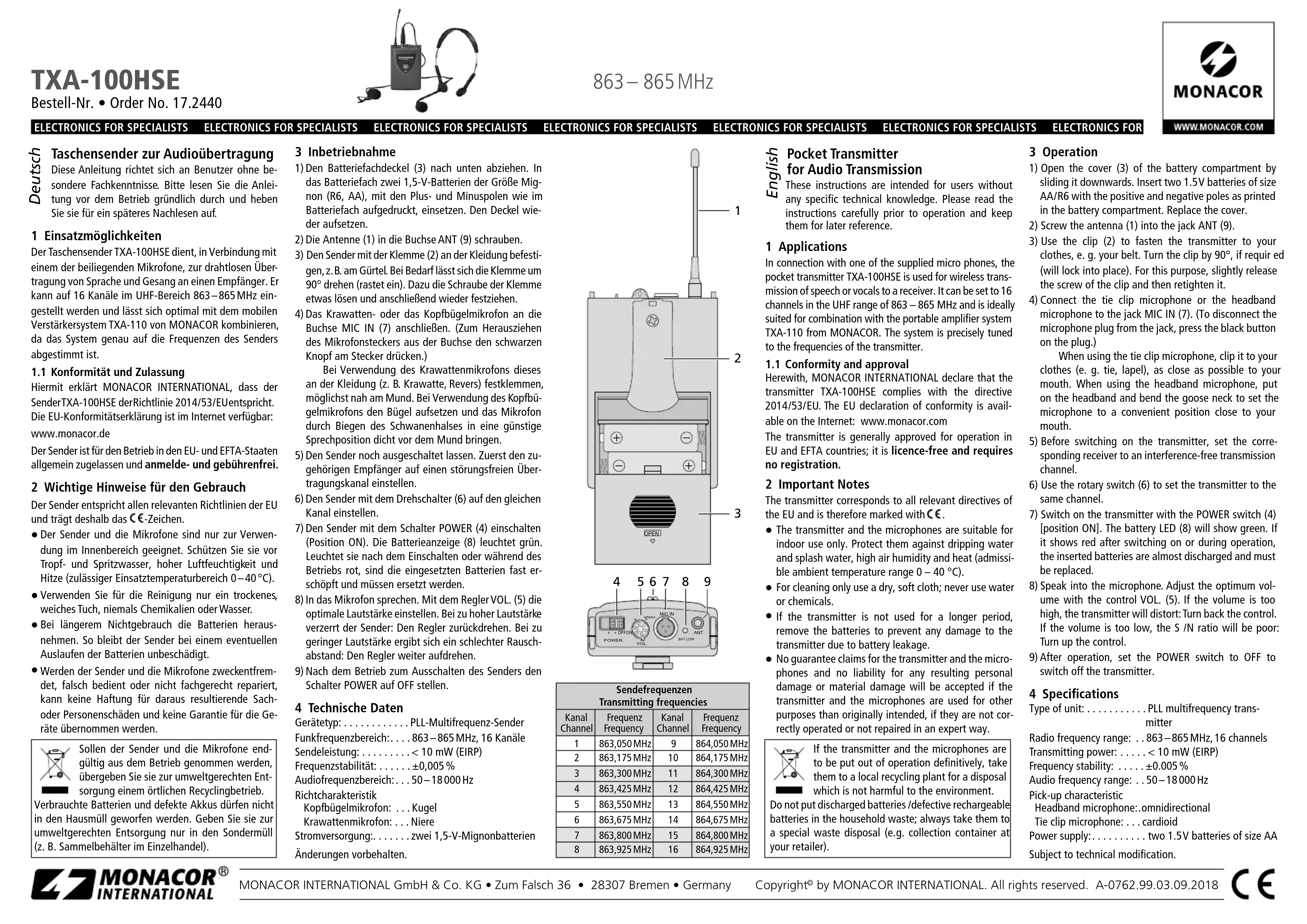 terruttore POWER su OFF. 4 Dati tecnici Tipo dell’unità: . . . . . . . . . . . trasmettitore PLL multifre- quenza Gamma di frequenze radio: . 863 – 865 MHz, 16 canali Potenza di trasmissione:. . . . < 10 mW (EIRP) Stabilità di frequenza: . . . . . ±0,005 % Gamma di frequenze audio: . 50 – 18 000 Hz Caratteristica direzionale microfono headset: . . . . . . onnidirezionale microfono a cravatta: . . . . cardioide Alimentazione: . . . . . . . . . . . due batterie stilo 1,5 V Con riserva di modifiche tecniche. Emetteur pour la transmission audio Cette notice s‘adresse aux utilisateurs sans connais- sances techniques particulières. Veuillez lire la pré- sente notice avec attention avant le fonctionnement et conservez-la pour pouvoir vous y reporter ulté- rieurement. 1 Possibilités d’utilisation L’émetteur de poche TXA-100HSE sert, combiné à un des microphones livrés, pour la transmission sans fil de dis- cours et chant vers un récepteur. Il se règle sur 16 canaux dans la plage UHF 863 – 865 MHz et peut être combiné de manière optimale avec le système amplifié portatif TXA-110 de MONACOR, puisque le système est réglé avec précision sur les fréquences de l’émetteur.