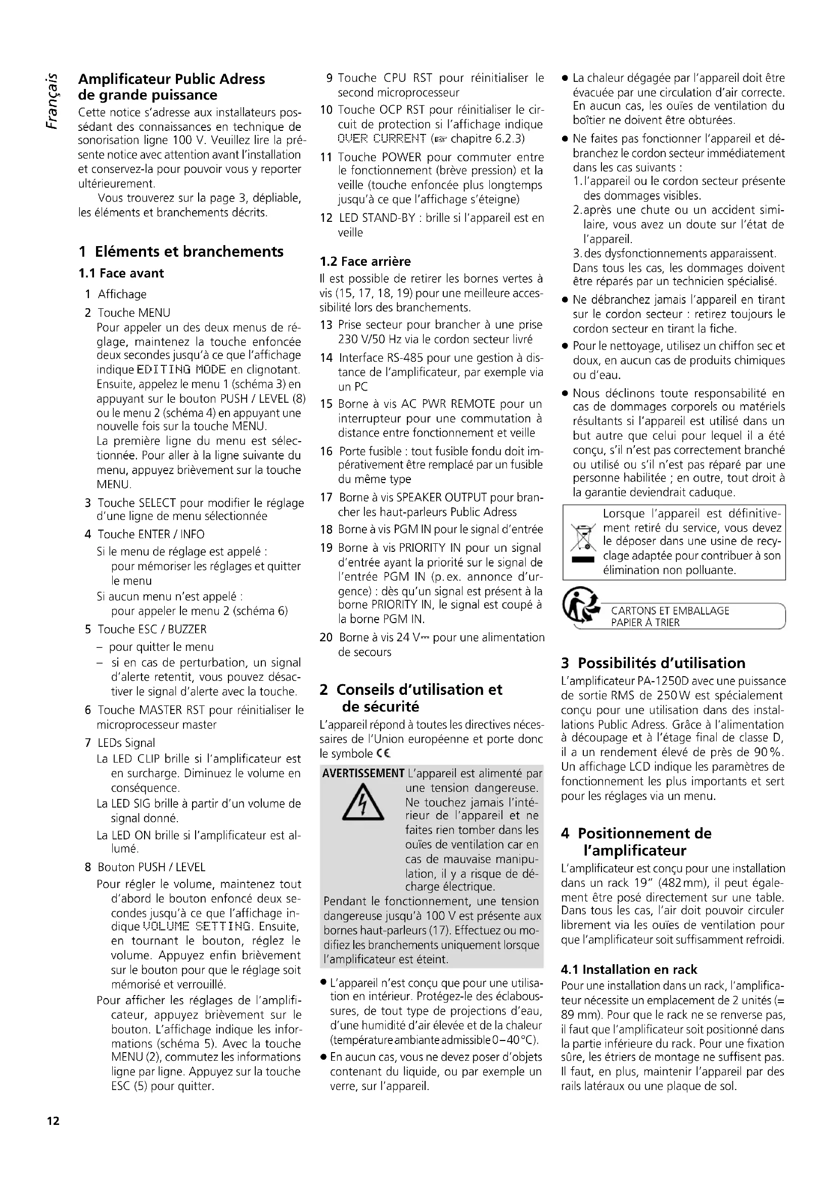 Il est possible de retirer les bornes vertes à vis(15, 17, 18, 19) pour une meilleure acces-sibilité lors des branchements. Prise secteur pour brancher à une prise 230 V/ 50 Hz via le cordon secteur livré14 Interface RS-485 pour une gestion à dis-tance de l’amplificateur, par exemple via un PC Borne à vis AC PWR REMOTE pour un interrupteur pour une commutation à distance entre fonctionnement et veille16 Porte fusible : tout fusible fondu doit im-pérativement être remplacé par un fusible du même type17 Borne à vis SPEAKER OUTPUT pour bran-cher les haut-parleurs Public Adress Borne à visPGM IN pour le signal d’entrée Borne à visPRIORITY IN pour un signal d’entrée ayant la priorité sur le signal de l’entrée PGM IN (p. ex. annonce d’ur-gence) : dès qu’un signal est présent à la borne PRIORITY IN, le signal est coupé à la borne PGM IN.20 Borne à vis 24 V⎓ pour une alimentation de secours 2 Conseils d’utilisation et desécurité L’appareil répond à toutes les directives néces-saires de l’Union européenne et porte donc le symbole AVERTISSEMENT L’appareil est alimenté par une tension dangereuse. Ne touchez jamais l’inté-rieur de l’appareil et ne faites rien tomber dans les ouïes de ventilation car en cas de mauvaise manipu-lation, il y a risque de dé-charge électrique.Pendant le fonctionnement, une tension dangereuse jusqu’à 100 V est présente aux bornes haut-parleurs (17). Effectuez ou mo-difiez les branchements uniquement lorsque l’amplificateur est éteint. L’appareil n’est conçu que pour une utilisa-tion en intérieur. Protégez-le des éclabous-sures, de tout type de projections d’eau, d’une humidité d’air élevée et de la chaleur (température ambiante admissible 0 – 40 °C). En aucun cas, vous ne devez poser d’objets contenant du liquide, ou par exemple un verre, sur l’appareil. La chaleur dégagée par l’appareil doit être évacuée par une circulation d’air correcte. En aucun cas, les ouïes de ventilation du boîtier ne doivent être obturées. Ne faites pas fonctionner l’appareil et dé-branchez le cordon secteur immédiatement dans les cas suivants : 1. l’appareil ou le cordon secteur présente des dommages visibles. après une chute ou un accident simi-laire, vous avez un doute sur l’état de l’appareil.3. des dysfonctionnements apparaissent.Dans tous les cas, les dommages doivent être réparés par un technicien spécialisé. Ne débranchez jamais l’appareil en tirant sur le cordon secteur : retirez toujours le cordon secteur en tirant la fiche. Pour le nettoyage, utilisez un chiffon sec et doux, en aucun cas de produits chimiques ou d’eau. Nous déclinons toute responsabilité en cas de dommages corporels ou matériels résultants si l’appareil est utilisé dans un but autre que celui pour lequel il a été conçu, s’il n’est pas correctement branché ou utilisé ou s’il n’est pas réparé par une personne habilitée ; en outre, tout droit à la garantie deviendrait caduque.Lorsque l’appareil est définitive-ment retiré du service, vous devez le déposer dans une usine de recy- clage adaptée pour contribuer à son élimination non polluante.CARTONS ET EMBALLAGE PAPIER À TRIER 3 Possibilités d’utilisation L’amplificateur PA-1250D avec une puissance de sortieRMS de 250 W est spécialement conçu pour une utilisation dans des instal-lations Public Adress. Grâce à l’alimentation à découpage et à l’étage final de classe D, il a un rendement élevé de près de 90 %. Un affichage LCD indique les paramètres de fonctionnement les plus importants et sert pour les réglages via un menu. 4 Positionnement de l’amplificateur L’amplificateur est conçu pour une installation dans un rack 19” (482 mm), il peut égale-ment être posé directement sur une table. Dans tous les cas, l’air doit pouvoir circuler librement via les ouïes de ventilation pour que l’amplificateur soit suffisamment refroidi.