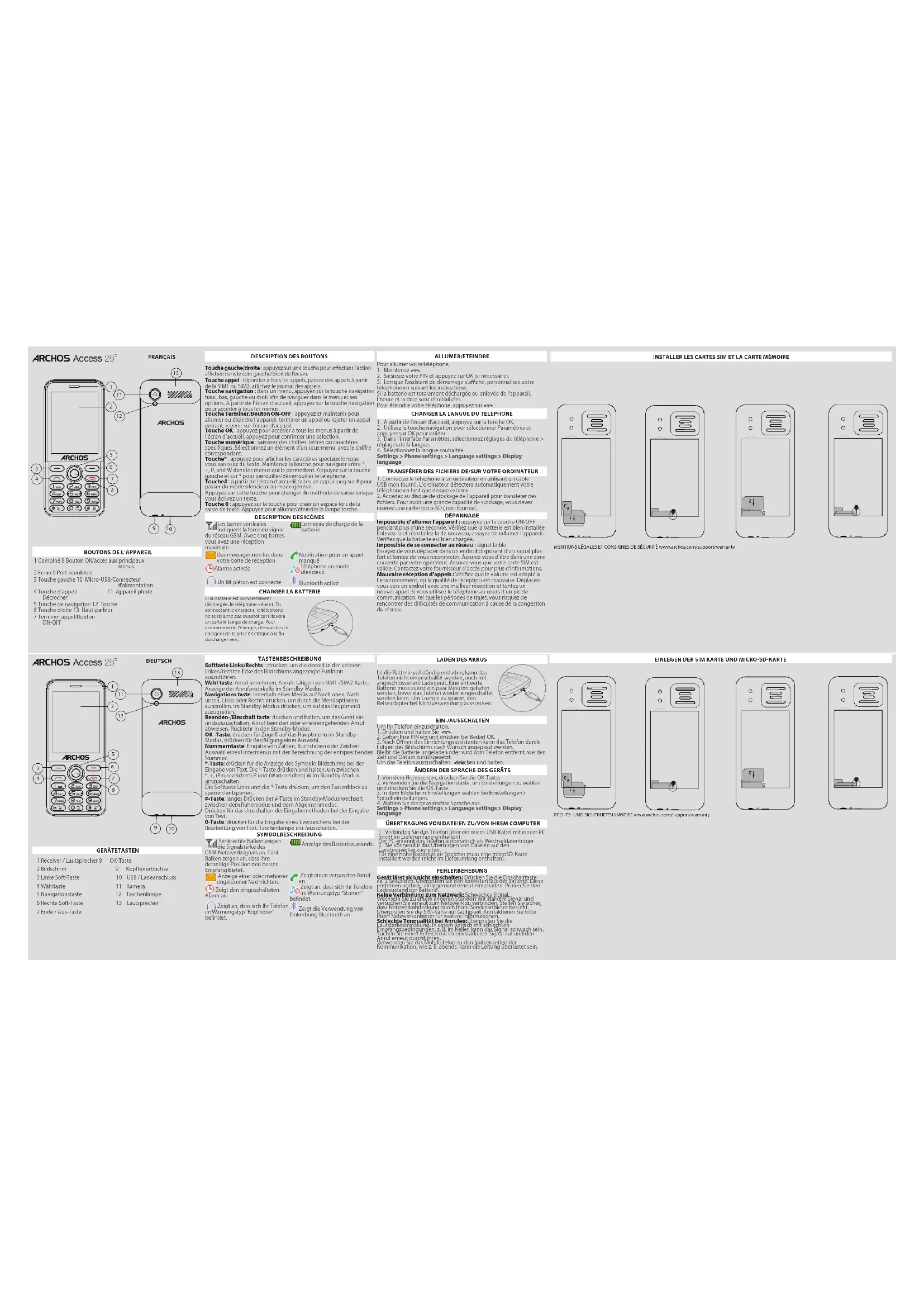 chiers. Pour avoir une grande capacité de stockage, vous devez insérez une carte micro-SD ( non fournie). DÉPANNAGE Impossible d’allumer l’appareil : appuyez sur la touche ON-OFF pendant plus d’une seconde. Vériez que la batterie est bien installée. Enlevez-la et réinstallez la de nouveau, essayez de rallumer l’appareil. Vériez que la batterie est bien chargée. Impossible de se connecter au réseau : signal faible. Essayez de vous déplacer dans un endroit disposant d’un signal plus fort et tentez de vous reconnecter. Assurez-vous d’être dans une zone couverte par votre opérateur. Assurez-vous que votre carte SIM est valide. Contactez votre fournisseur d’accès pour plus d’informations. Mauvaise réception d’appels : Vériez que le volume est adapté à l’environnement, où la qualité de réception est mauvaise. Déplacez- vous vers un endroit avec une meilleur réception et tentez un nouvel appel. Si vous utilisez le téléphone au cours d’un pic de communication, tel que les périodes de trajet, vous risquez de rencontrer des dicultés de communication à cause de la congestion du réseau. FRANÇAIS INSTALLER LES CARTES SIM ET LA CARTE MÉMOIRE DEUTSCH ARCHOS Access 28F V2 2018-10-1