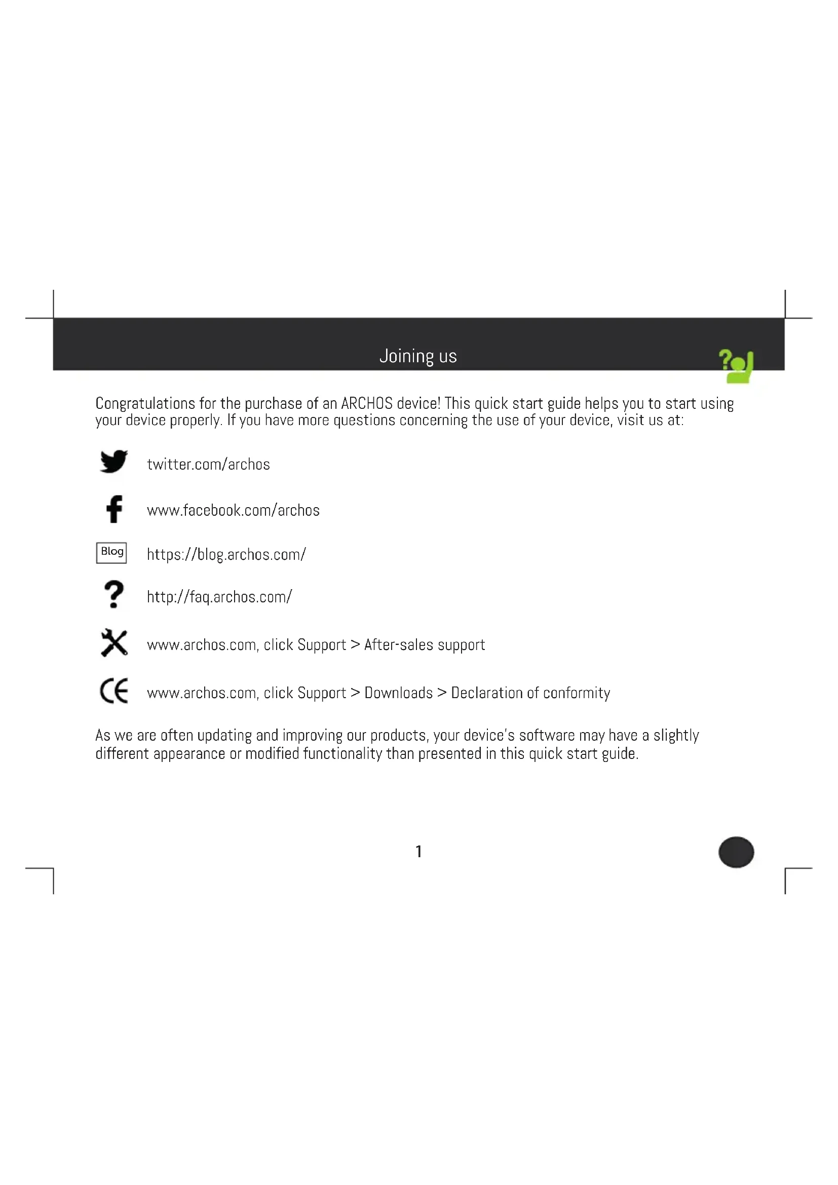 Félicitations! Vous venez d’acquérir un appareil ARCHOS! Ce guide de démarrage rapide vous aide à bien débuter l’usage de votre appareil. Si vous avez d’autres questions sur l’usage de votre appareil, visitez nos liens ci-dessous : twitter.com/archos www.facebook.com/archos Blog https://blog.archos.com/ http://faq.archos.com/ www.archos.com, click Support > After-sales support www.archos.com, cliquez Support > Téléchargements > Déclaration de conformité Comme nous mettons à jour et améliorons régulièrement nos produits, le logiciel de votre appareil peut présenter une interface ou des fonctionnalités légèrement différentes de celles décrites dans ce guide. Contactez-nous8 Warranty 70 Platinum 3G AC70PL3G Déballage ARCHOS 70 Platinum 3G Guide d’utilisation rapide Adaptateur Câble de charge Livret des garanties et des mentions légales et sécuritaires9 70 Platinum 3G AC70PL3G