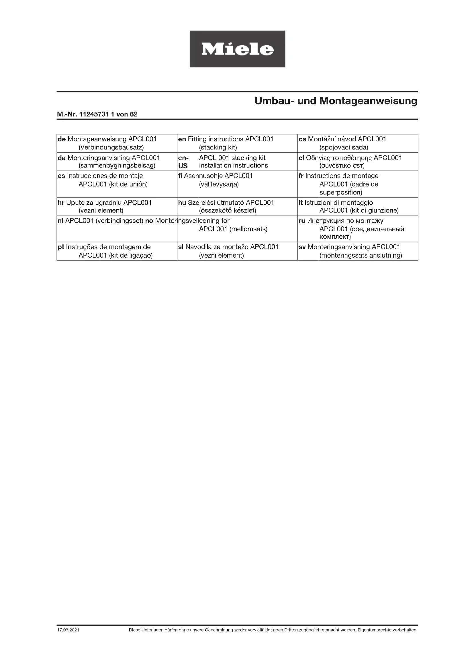 Instructions de montage APCL001 (cadre de superposition) Motif: Installer la colonne lave-linge/ sèche-linge. Pour les petites entreprises PWM x0x et PDR x0x. 11167420 - APCL001 Kit de superposition lave-linge/ sèche-linge SST Pièces nécessaires Nombre N° Mat. Dénomination 1 11167420 APCL001 Kit de superposition lave-linge/ sèche-linge Pièces fournies Nombre N° Mat. Dénomination 1 10975581 Cadre 2 09470481 Pied support arrière WTV 2 09470501 Pied support avant WTV 4 11245320 Entretoise BG APCL001, pour couvercle blanc lotus 4 11082270 Douille taraudée M4, pour couvercle blanc lotus 4 06532030 Vis à tête fraisée M 4 X 16, pour couvercle blanc lotus 2 09049222 Bouchons du couvercle LW, pour couvercle blanc lotus 1 02745300 Mastic d'étanchéité silicone W 228/5ml, pour couvercle blanc lotus 4 11121760 Joint entretoise, pour couvercle inox 8 07270730 Vis à tête fraisée M 4 X 12, pour couvercle inox 1 11245731 Notice de montage APCL001 Outils spéciaux Nombre N° Mat. Dénomination 1 Foret bois/ plastique 2mm 1 Foret bois/ plastique 6mm 1 Pointage 1 Foret acier 2mm 1 Foret acier 3mm 1 Clé Allen 3,5mm ou un bit de tournevis à tête plate 0,6x3,5mmUmbau- und Montageanweisung M.-Nr. 11245731 34 von 62 Diese Unterlagen dürfen ohne unsere Genehmigung weder vervielfältigt noch Dritten zugänglich gemacht werden. Eigentumsrechte vorbehalten. 17.03.2021 Conseil Des pièces pour couvercle blanc lotus et inox sont jointes au cadre de superposition. Sélectionner les pièces adaptées au couvercle du lave-linge. Danger en cas de travaux de maintenance non conformes AVERTISSEMENT Danger en cas de travaux de maintenance non conformes. Des travaux de maintenance non conformes peuvent causer des dommages matériels élevés ainsi que de graves blessures avec conséquences mortelles. A Les travaux de maintenance doivent être exécutés uniquement par un électricien qualifié possédant la formation, les connaissances et l'expérience professionnelles adéquates. A Les consignes de sécurité en vigueur doivent être respectées. A Lire la documentation technique du Service (TSD) avant d'agir. Risque de blessure lors du montage DANGER Risque d’électrocution! Les éléments conducteurs d'électricité représentent un danger. A Avant toute intervention de maintenance et de réparation de l'appareil, débrancher l'appareil du réseau électrique. DANGER Risque d'accident A Ne monter le cadre de superposition qu'aux lave-linge ou sèche-linge qui ne sont pas installés. Désinstallation: voir le mode d'emploi de la machine. A Veiller à ce que les enfants ou les animaux ne puissent pas pénétrer dans la pièce où les travaux sont effectués pendant le montage. DANGER Risque d'écrasement A Porter des gants antidérapants et des chaussures de sécurité. A Ne pas mettre de parties du corps, en particulier les mains ou les pieds, sous ou entre les appareils. DANGER Risque de blessure, en particulier au niveau de la colonne vertébrale, car le sèche-linge doit être placé sur le lave-linge pour le montage. A Prendre en compte le poids des appareils et ne pas surestimer sa force. Voir le mode d'emploi de l'appareil pour le poids de l'appareil. Installer le cadre de superposition APCL001 Couvercle blanc lotus A Retirer le film de protection du cadre. A Faire reposer le cadre à l'arrière sur le couvercle, ajuster et marquer les 4 trous percés (1), voir fig. 1. A Avec un tournevis, piquer dans les bouchons (caches latéraux) du couvercle, voir fig. 2, (A).