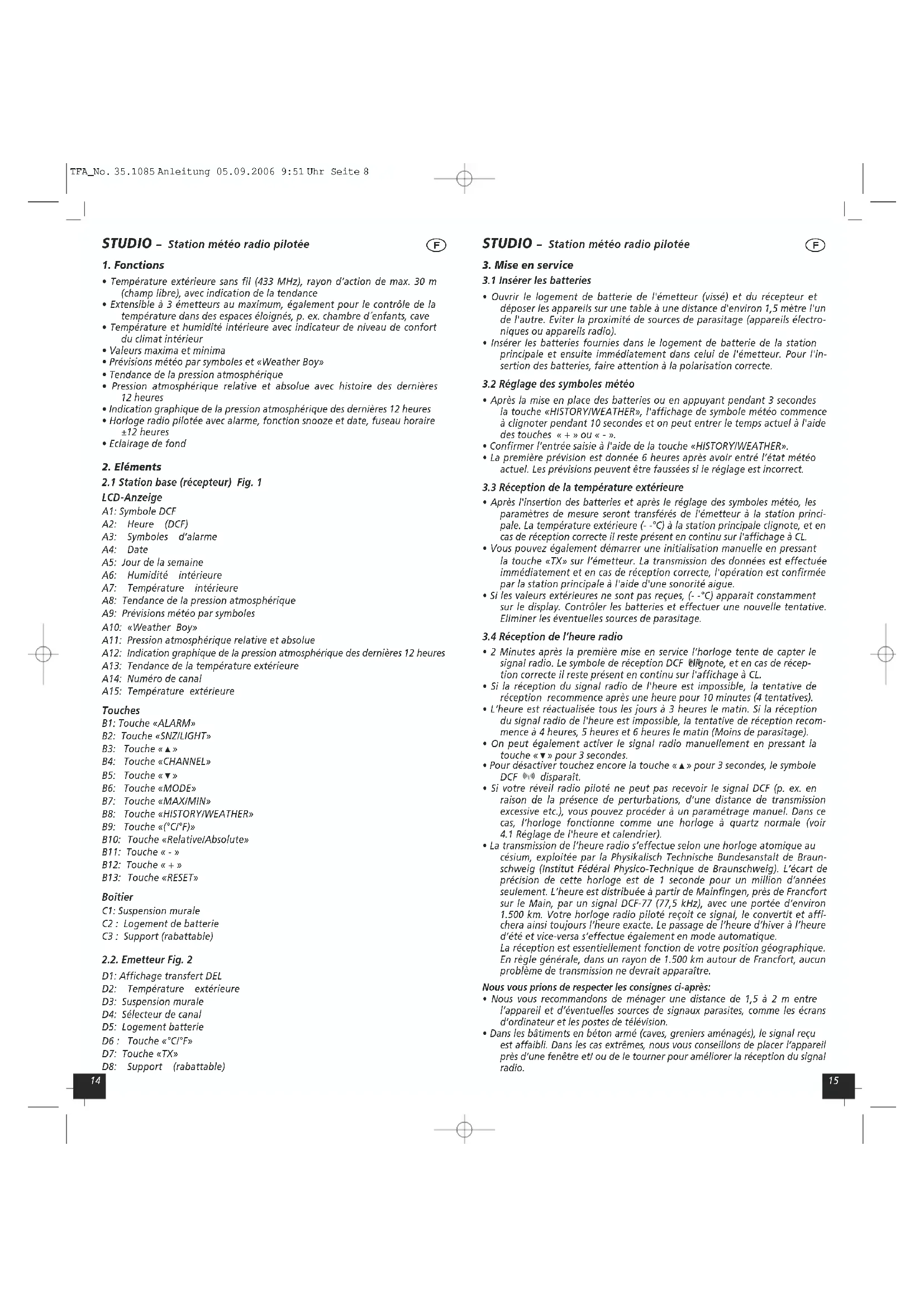 Plages de mesure: Température intérieure: 0…+50°C (32…+122°F)Température extérieure: -20…+50°C (-4…+122°F)Humidité: 20…99% HRBatteries: 3 x 1,5 V AA pour station de base et 2 x 1,5 V AAA pour l’émetteur (comprises)Dimension:Station de base: 187 x 105 x 30 mm Emetteur: 95 x 60 x 28 mmNous déclarons ici que cet appareil émetteur récepteur d'ondes radio répondaux exigences essentielles de la directive R&TTE 1999/5/CE.TFA Dostmann GmbH & Co.KG, Wertheim / www.tfa-dostmann.de TFA_No. 35.1085 Anleitung 05.09.2006 9:51 Uhr Seite 10STUDIO – Stazione barometrica radio controllata