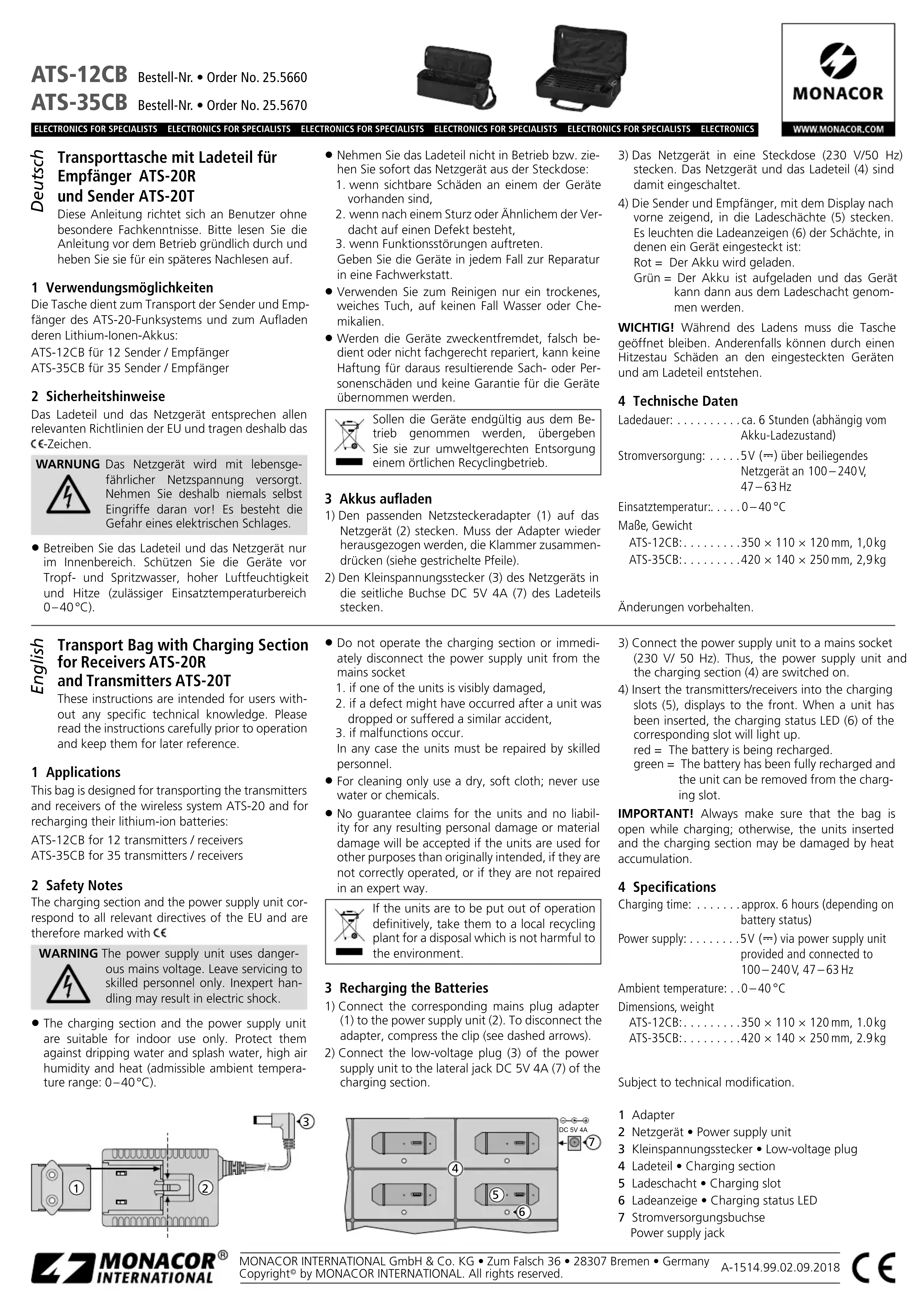 rivolti in avanti, nei vani di ricarica (5). Si accen- dono le spie di ricarica (6) dei vani dove è inserito un apparecchio: Rosso = batteria in fase di ricarica. Verde = batteria carica; l’apparecchio può essere tolto. IMPORTANTE! Durante la ricarica, la borsa deve rimanere aperta. Altrimenti un accumulo di calore può danneggiare gli apparecchi inseriti e il caricatore stesso. 4 Dati tecnici Durata di ricarica: ca 6 ore (dipende dallo stato di carica della batteria) Alimentazione: 5 V (⎓) tramite alimentatore in dotazione con 100 – 240 V, 47 – 63 Hz Temperatura d’esercizio: 0 – 40 °C Dimensioni, peso ATS-12CB: 350 × 110 × 120 mm, 1,0 kg ATS-35CB: 420 × 140 × 250 mm, 2,9 kg Con riserva di modifiche tecniche. ATS-12CB Réf. num. • Codice 25.5660 ATS-35CB Réf. num. • Codice 25.5670 Sacoche de transport avec chargeur pour les récepteurs ATS-20R et les émetteurs ATS-20T Cette notice s’adresse aux utilisateurs sans connaissances techniques particulières. Veuillez lire la présente notice avec attention avant le fonctionnement et conservez-la pour pouvoir vous y reporter ultérieurement. 1 Possibilités d’utilisation La sacoche permet de transporter les émetteurs et récepteurs du système sans fil ATS-20 et de charger leurs accumulateurs Lithium-ion ATS-12CB pour 12 émetteurs / récepteurs ATS-35CB pour 35 émetteurs / récepteurs 2 Conseils de sécurité Le chargeur et le bloc secteur répondent à toutes les directives nécessaires de l’Union européenne et portent donc le symbole