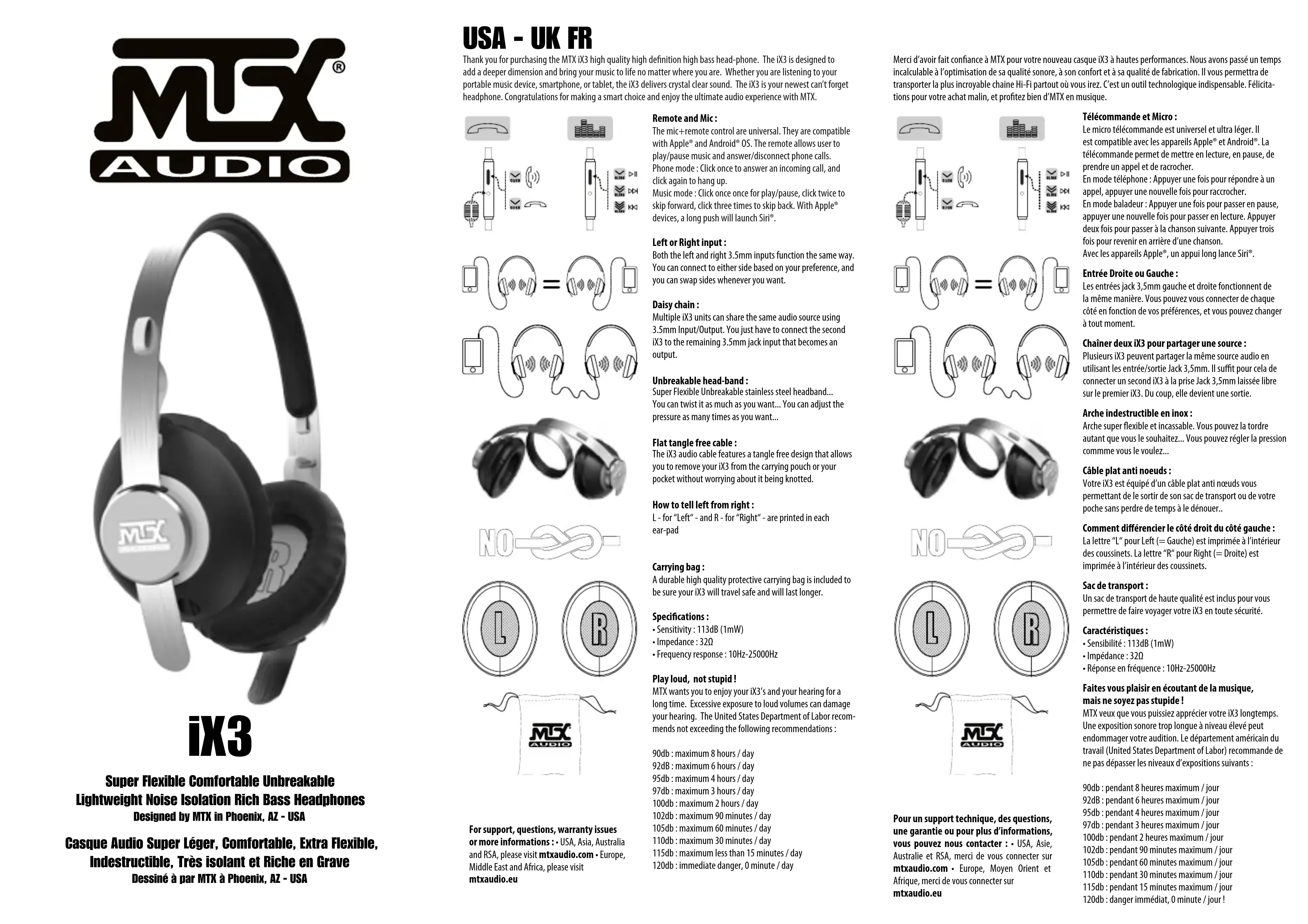 Thank you for purchasing the MTX iX3 high quality high definition high bass head-phone. The iX3 is designed to add a deeper dimension and bring your music to life no matter where you are. Whether you are listening to your portable music device, smartphone, or tablet, the iX3 delivers crystal clear sound. The iX3 is your newest can’t forget headphone. Congratulations for making a smart choice and enjoy the ultimate audio experience with MTX. Remote and Mic : The mic+remote control are universal. They are compatible with Apple® and Android® OS. The remote allows user to play/pause music and answer/disconnect phone calls. Phone mode : Click once to answer an incoming call, and click again to hang up. Music mode : Click once once for play/pause, click twice to skip forward, click three times to skip back. With Apple® devices, a long push will launch Siri®. Left or Right input : Both the left and right 3.5mm inputs function the same way. You can connect to either side based on your preference, and you can swap sides whenever you want. Daisy chain : Multiple iX3 units can share the same audio source using 3.5mm Input/Output. You just have to connect the second iX3 to the remaining 3.5mm jack input that becomes an output. Unbreakable head-band : Super Flexible Unbreakable stainless steel headband... You can twist it as much as you want... You can adjust the pressure as many times as you want... Play loud, not stupid ! MTX wants you to enjoy your iX3’s and your hearing for a long time. Excessive exposure to loud volumes can damage your hearing. The United States Department of Labor recom- mends not exceeding the following recommendations : 90db : maximum 8 hours / day 92dB : maximum 6 hours / day 95db : maximum 4 hours / day 97db : maximum 3 hours / day 100db : maximum 2 hours / day 102db : maximum 90 minutes / day 105db : maximum 60 minutes / day 110db : maximum 30 minutes / day 115db : maximum less than 15 minutes / day 120db : immediate danger, 0 minute / day Flat tangle free cable : The iX3 audio cable features a tangle free design that allows you to remove your iX3 from the carrying pouch or your pocket without worrying about it being knotted. How to tell left from right : L - for “Left“ - and R - for “Right“ - are printed in each ear-pad Carrying bag : A durable high quality protective carrying bag is included to be sure your iX3 will travel safe and will last longer. Merci d’avoir fait confiance à MTX pour votre nouveau casque iX3 à hautes performances. Nous avons passé un temps incalculable à l’optimisation de sa qualité sonore, à son confort et à sa qualité de fabrication. Il vous permettra de transporter la plus incroyable chaine Hi-Fi partout où vous irez. C’est un outil technologique indispensable. Félicita- tions pour votre achat malin, et profitez bien d’MTX en musique. Arche indestructible en inox : Arche super flexible et incassable. Vous pouvez la tordre autant que vous le souhaitez... Vous pouvez régler la pression commme vous le voulez... Câble plat anti noeuds : Votre iX3 est équipé d’un câble plat anti nœuds vous permettant de le sortir de son sac de transport ou de votre poche sans perdre de temps à le dénouer.. Chaîner deux iX3 pour partager une source : Plusieurs iX3 peuvent partager la même source audio en utilisant les entrée/sortie Jack 3,5mm. Il suffit pour cela de connecter un second iX3 à la prise Jack 3,5mm laissée libre sur le premier iX3. Du coup, elle devient une sortie. Entrée Droite ou Gauche : Les entrées jack 3,5mm gauche et droite fonctionnent de la même manière. Vous pouvez vous connecter de chaque côté en fonction de vos préférences, et vous pouvez changer à tout moment. Télécommande et Micro : Le micro télécommande est universel et ultra léger. Il est compatible avec les appareils Apple® et Android®. La télécommande permet de mettre en lecture, en pause, de prendre un appel et de racrocher. En mode téléphone : Appuyer une fois pour répondre à un appel, appuyer une nouvelle fois pour raccrocher. En mode baladeur : Appuyer une fois pour passer en pause, appuyer une nouvelle fois pour passer en lecture. Appuyer deux fois pour passer à la chanson suivante. Appuyer trois fois pour revenir en arrière d’une chanson. Avec les appareils Apple®, un appui long lance Siri®. Comment différencier le côté droit du côté gauche : La lettre “L“ pour Left (= Gauche) est imprimée à l’intérieur des coussinets. La lettre “R“ pour Right (= Droite) est imprimée à l’intérieur des coussinets. Sac de transport : Un sac de transport de haute qualité est inclus pour vous permettre de faire voyager votre iX3 en toute sécurité. Faites vous plaisir en écoutant de la musique, mais ne soyez pas stupide ! MTX veux que vous puissiez apprécier votre iX3 longtemps. Une exposition sonore trop longue à niveau élevé peut endommager votre audition. Le département américain du travail (United States Department of Labor) recommande de ne pas dépasser les niveaux d’expositions suivants : 90db : pendant 8 heures maximum / jour 92dB : pendant 6 heures maximum / jour 95db : pendant 4 heures maximum / jour 97db : pendant 3 heures maximum / jour 100db : pendant 2 heures maximum / jour 102db : pendant 90 minutes maximum / jour 105db : pendant 60 minutes maximum / jour 110db : pendant 30 minutes maximum / jour 115db : pendant 15 minutes maximum / jour 120db : danger immédiat, 0 minute / jour ! Pour un support technique, des questions, une garantie ou pour plus d’informations, vous pouvez nous contacter : • USA, Asie, Australie et RSA, merci de vous connecter sur mtxaudio.com • Europe, Moyen Orient et Afrique, merci de vous connecter sur mtxaudio.eu For support, questions, warranty issues or more informations : • USA, Asia, Australia and RSA, please visit mtxaudio.com • Europe, Middle East and Africa, please visit mtxaudio.eu Specifications :