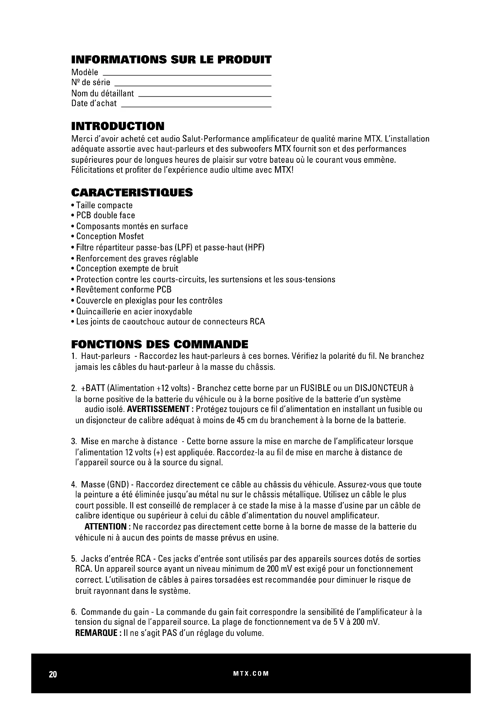 Modèle Nº de série Nom du détaillant Date d’achat INTRODUCTION Merci d’avoir acheté cet audio Salut-Performance amplificateur de qualité marine MTX. L’installation adéquate assortie avec haut-parleurs et des subwoofers MTX fournit son et des performances supérieures pour de longues heures de plaisir sur votre bateau où le courant vous emmène. Félicitations et profiter de l’expérience audio ultime avec MTX! CARACTERISTIQUES