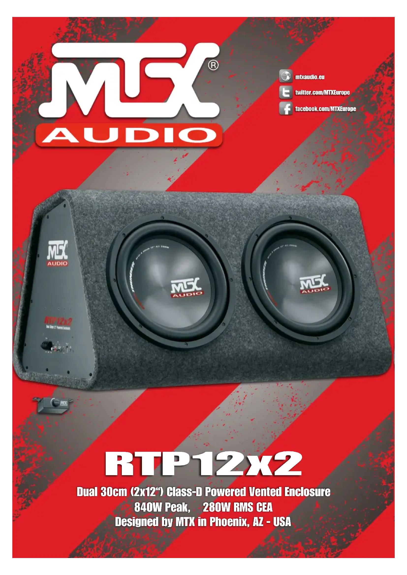 2. Déterminez l’emplacement de votre MTX RTP12x2. Pour un bon fonctionnement, il faut laisser de l’air devant la section amplificateur (pour son refroidissement) et devant le subwoofer. 3. Faites passer un câble d’alimentation de la batterie jusqu’au connecteur marqué ”+12V” sur l’amplificateur. Ne pas connecter ce câble pour le moment. Lors du passage à travers une tôle, il faut utiliser un caoutchouc de protection pour que le câble ne s’endom- mage pas. Attention à bien utiliser la section de câble recommandée. 4. Il faut installer un fusible et un porte fusible à moins de 20cm de la batterie du véhicule. C’est une protection très importante pour vous et votre véhicule en cas d’accident ou de court-circuit. Vous pouvez maintenant connecter le câble d’alimentation +12V sur la borne positive (rouge) de la batterie. 5. Trouvez une très bonne masse, la plus courte possible (donc proche de l’amplificateur). Le point de contact doit être décapé (plus de peinture) pour assurer un contact optimal et un transfert de courant maximum. Utiliser la même section de câble que pour l’alimenta- tion. Branchez la masse au connecteur marqué “GND” sur l’amplificateur puis visser l’autre extrémité à la tôle du véhicule. 6. Connectez un câble de commande d’allumage (remote) et d’extinction de votre source au bornier marqué “Rem.” sur l’amplificateur. Ce câble est généralement de petite section et de couleur bleue. Il se trouve à l’arrière de votre source. Il est parfois marqué “remote” ou “power antenna”. 7. Connectez les câbles RCA de votre source aux borniers marqués “INPUT”. Si votre source n’est pas équipée de câbles RCA, vous pouvez utiliser les adaptateurs haut niveau fournis (High Level Input). Il faut alors brancher les câbles haut-parleur de votre source à ces adaptateurs, puis brancher l’adaptateur dans le bornier “High Level Input”. 8. Vérifiez tous les points de montage précédents, en particulier le câblage et les connexions. Si tout est en ordre, vous pouvez recon- necter la masse de la batterie. Puis placez le fusible dans son porte fusible. Attention : pour commencer les réglages, la sensibilité “GAIN” sur l’amplificateur doit être en position minimum, donc à fond dans le sens contraire des aiguilles d’une montre. Comment rester connecté : https://www.facebook.com/MTXEurope https://twitter.com/MTXEurope http://www.mtxaudio.euGain Input EBC Remote High Level Input 6V - 0,2V Prot. PWR. +12V GND Ch.1 Ch.2 Power REM Manual de usuario - MTX RTP12x2 Muchas Gracias ! Gracias por elegir el producto MTX para un máximo de sonido en tu vehículo. Con los amplificadores, altavoces y subs MTX y conexiones StreetWires podrá eschuchar, sentir y experimentar la música como nunca antes y de la forma que el artista pretendía cuando se grabó. Especificaciones :
