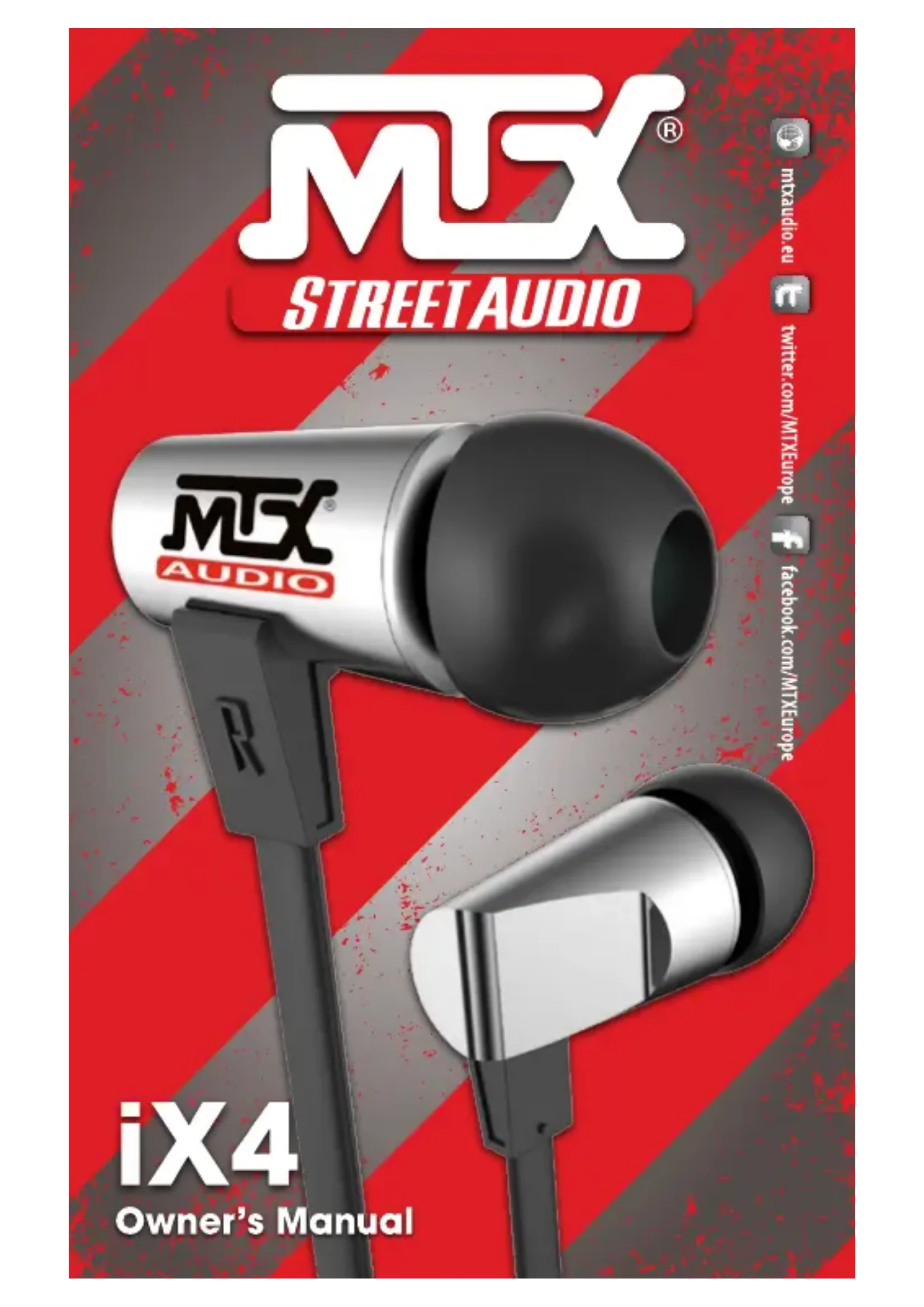 - Réponse en fréquence : 10Hz-25000Hz Faites vous plaisir en écoutant de la musique, mais ne soyez pas stupide ! MTX veux que vous puissiez apprécier votre iX4 longtemps. Une exposition sonore trop longue à niveau élevé peut endommager votre audition. Le département américain du travail (United States Department of Labor) recommande de ne pas dépasser les niveaux d’expositions suivants : 90db : pendant 8 heures maximum / jour 92dB : pendant 6 heures maximum / jour 95db : pendant 4 heures maximum / jour 97db : pendant 3 heures maximum / jour 100db : pendant 2 heures maximum / jour 102db : pendant 90 minutes maximum / jour 105db : pendant 60 minutes maximum / jour 110db : pendant 30 minutes maximum / jour 115db : pendant 15 minutes maximum / jour 120db : danger immédiat, 0 minute / jour ! Pour un support technique, des questions, une garantie ou pour plus d’informations, vous pouvez nous contacter :