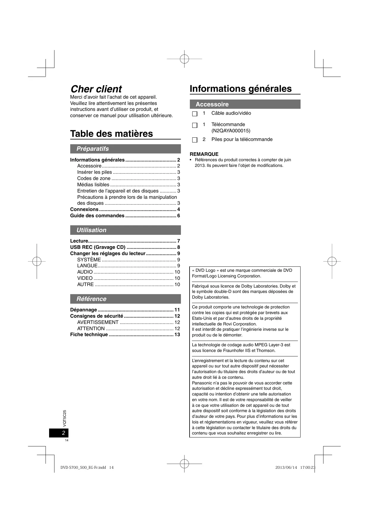- Références du produit correctes à compter de juin 2013. Ils peuvent faire l’objet de modifications. Référence Dépannage ....................................................... 11 Consignes de sécurité .................................... 12 AVERTISSEMENT ....................................... 12 ATTENTION ................................................. 12 Fiche technique ............................................... 13 « DVD Logo » est une marque commerciale de DVD Format/Logo Licensing Corporation. Fabriqué sous licence de Dolby Laboratories. Dolby et le symbole double-D sont des marques déposées de Dolby Laboratories. Ce produit comporte une technologie de protection contre les copies qui est protégée par brevets aux Etats-Unis et par d’autres droits de la propriété intellectuelle de Rovi Corporation. Il est interdit de pratiquer l’ingénierie inverse sur le produit ou de le démonter. VQT5C25 La technologie de codage audio MPEG Layer-3 est sous licence de Fraunhofer IIS et Thomson.