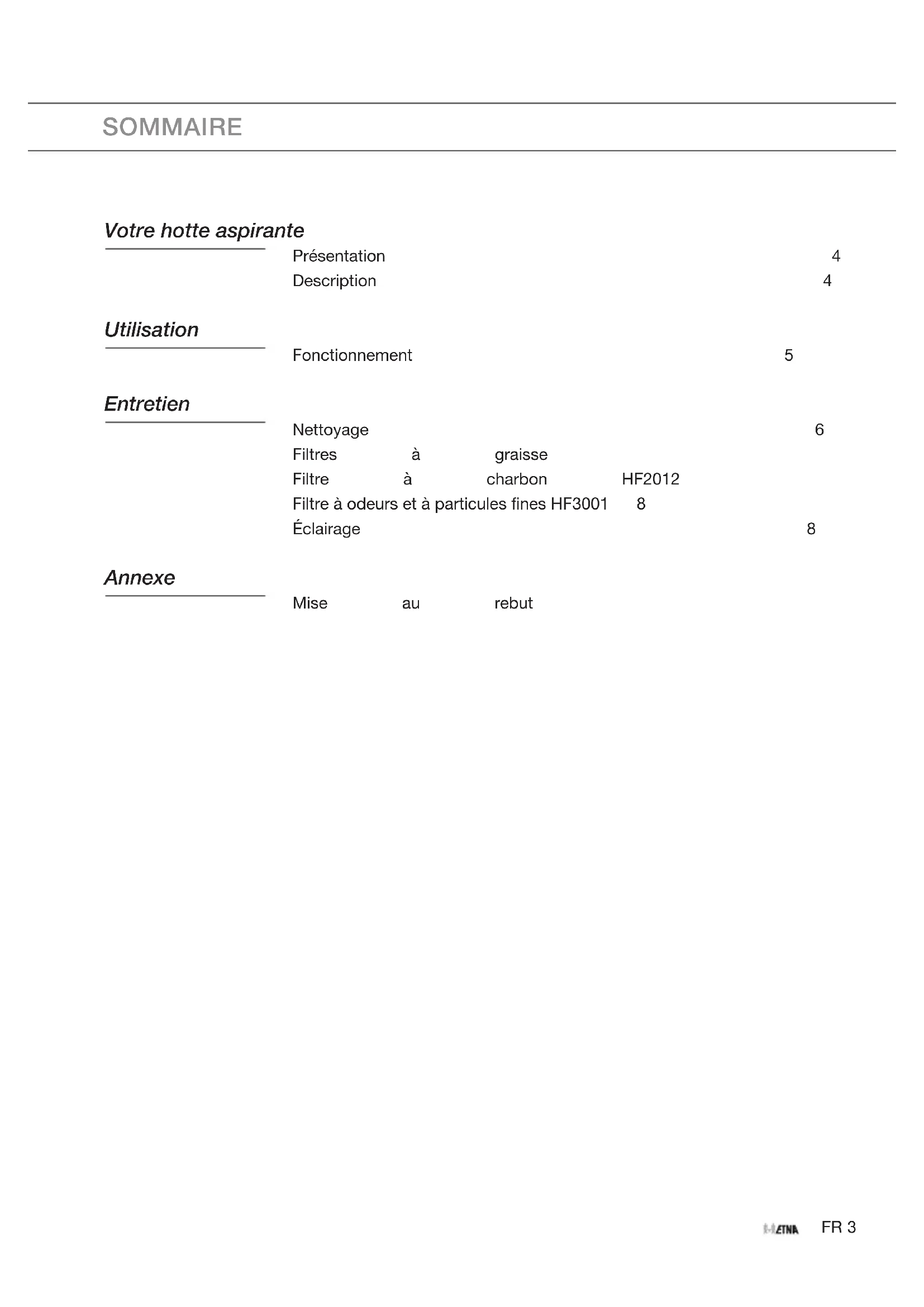 - polystyrène exempt de CFC (mousse dure PS). Ces matériaux doivent être mis au rebut de manière responsable et conforme aux dispositions gouvernementales. Pour rappeler l'obligation de traiter séparément les appareils électroménagers, un symbole représentant un conteneur à ordures barré d'une croix a été apposé sur le produit. Cela signifie qu'à l'issue de sa durée de vie, l'appareil ne peut être mis au rebut avec les déchets ménagers classiques. L'appareil doit être déposé dans un centre de collecte sélective de déchets prévu par l'administration communale oudans un point de vente fournissant ce service. Le traitement séparé d'un appareil électroménager permet d'éviter, pourl'environnement et la santé, les retombées négatives qui pourraient découler d'un traitement incorrect et permet de récupérer les matériaux qui le composent dans le but d'une économie importante en termes d'énergie et de ressources. Déclaration de conformité Nous déclarons, par la présente, que nos produits satisfont aux directives, décisions et régulations européennes en vigueur ainsi qu'aux exigences qui sont mentionnées dans les normes auxquelles il est fait référence.FR 10DE 3 INHALT Ihre Dunstabzugshaube Einführung 4 Beschreibung 4 Verwendung Bedienung 5 Wartung Reinigung 6 Fettfilter 7 Kohlefilter HF2012 7 Geruchs-/Feinstaubfilter HF3001 8 Beleuchtung 8 Anhang Entsorgung 9DE 4 Einführung Mithilfe dieser Anleitung werden Sie schon bald sehr vertraut mit der Verwendung dieses Geräts sein. Bitte lesen Sie sich die Sicherheits- und Wartungshinweise zu dem Gerät durch.Bitte bewahren Sie die Bedien- und Installationshinweise auf, da diese auch in Zukunft noch nützlich sein können. Lesen Sie vor der Verwendung des Gerätes die separaten Sicherheitshinweise! Die neueste Version der Bedienungsanleitung finden Sie auf unserer Website. Beschreibung ETNA symbols in mm 1:1