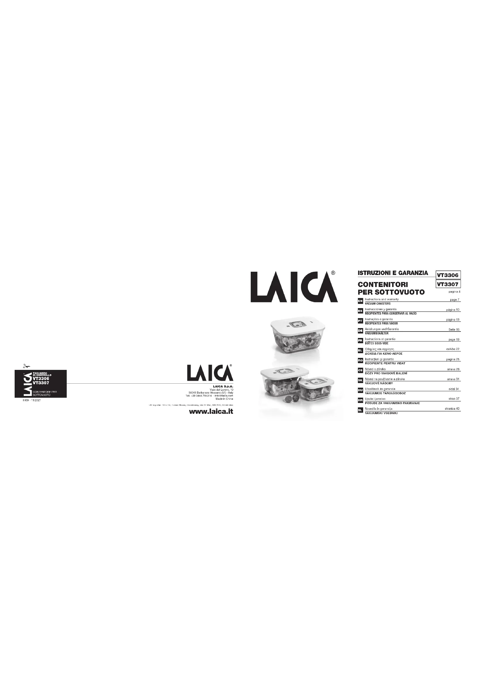 Problème Cause possible Remède La boîte ne retient pas le vide Les résidus de nourriture et/ou les corps étrangers au niveau de la soupape d’échappement et/ou du joint du couvercle ont empêché l'évacuation de l'air.Nettoyer et sécher soigneusement la soupape, le joint et répéter l'opération en suivant les instructions.La soupape d’échappement n'a pas été bien réinsérée dans le couvercle.Insérer correctement la soupape.La soupape s'est accidentellement endommagée.Remplacer la soupape en s'adressant au revendeur.Le couvercle n'est pas correctement positionné sur la boîte.Appuyez légèrement sur le couvercle de la boîte pour une fermeture optimale. GARANTIE Cet appareil est garanti pour une durée de 2 ans à partir de la date d’achat qui doit apparaître sur le tampon et la signature du revendeur et sur le reçu fiscal ci-joint que vous garderez avec soin. Cette période est conforme à la législation en vigueur et s’applique seulement au cas où le consommateur soit un sujet particulier. Les produits Laica sont projetés pour un emploi à la maison et on ne permet pas son emploi dans les locaux publiques. La garantie couvre uniquement les défauts de production et n’est pas valable si les dommages sont causés par des événements accidentels, par une utilisation incorrecte, par négligence ou par utilisation impropre du produit. Utiliser uniquement les accessoires fournis; l’utilisation d’accessoires divers peut entraîner l’annulation de la garantie. N’ouvrir en aucun cas l’appareil; en cas d’ouverture ou d’endommagement, la garantie sera annulée définitivement. La garantie n’est pas valide pour les pièces soumises à usure suite à leur emploi et aux batteries lorsqu’elles sont fournies en dotation. Une fois écoulés 2 ans dès la date d’achat, la garantie s’échoit; dans ce cas les interventions d’assistance technique seront réalisées sous paiement. Les informations sur les interventions d’assistance technique, soient elles en garantie ou sous paiement, pourront être demandées en contactant notre société à info@laica.com. Aucune forme de contribution est due pour les réparations et les remplacements inclus dans les termes de la garantie. En cas de pannes, s’adresser à son revendeur; NE PAS expédier directement à LAICA. Toutes les interventions en garantie (incluses celles de remplacement du produit ou bien d’une de ses parties) ne prolongeront pas la durée de la période de garantie originale du produit remplacé. La maison constructrice décline toute responsabilité en cas d’éventuels dommages causés, directement ou indirectement, aux personnes, choses et animaux domestiques suite au manque d’attention à toutes les prescriptions indiquées sur le livret d’instruction et concernant, de manière particulière, les conseils relatifs à l’installation, l’utilisation et l’entretien de l’appareil. Il est faculté de la société Laica, qui est constamment engagée dans l’amélioration de ses produits, de modifier sans aucun avis au préalable totalement ou partiellement ses propres produits en relation avec la nécessité de production, sans que cela implique aucune responsabilité de la part de la société Laica ou de ses vendeurs.22 23 ΔΟΧΕΙΔ ΓΙΑ ΚΕΝΟ ΑΕΡΟΣ - ΟΔΗΓΙΕΣ ΚΑΙ ΕΓΓΥΗΣΗ Αγαπητέ πελάτη, η Laica σας ευχαριστεί για την προτίμηση που δείξατε στο προϊόν μας το οποίο σχεδιάστηκε με κριτήρια αξιοπιστίας και απώτερο σκοπό να ικανοποιήσουμε τις απαιτήσεις σας.