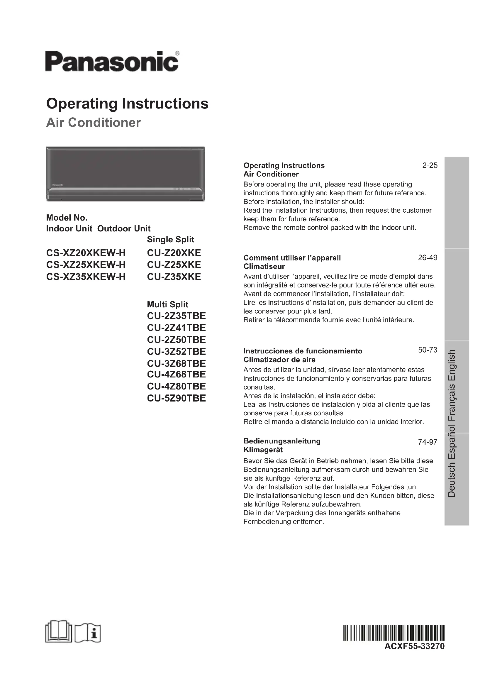 CUZ25XKE - Climatisation PANASONIC - Notice d'utilisation et mode d'emploi gratuit