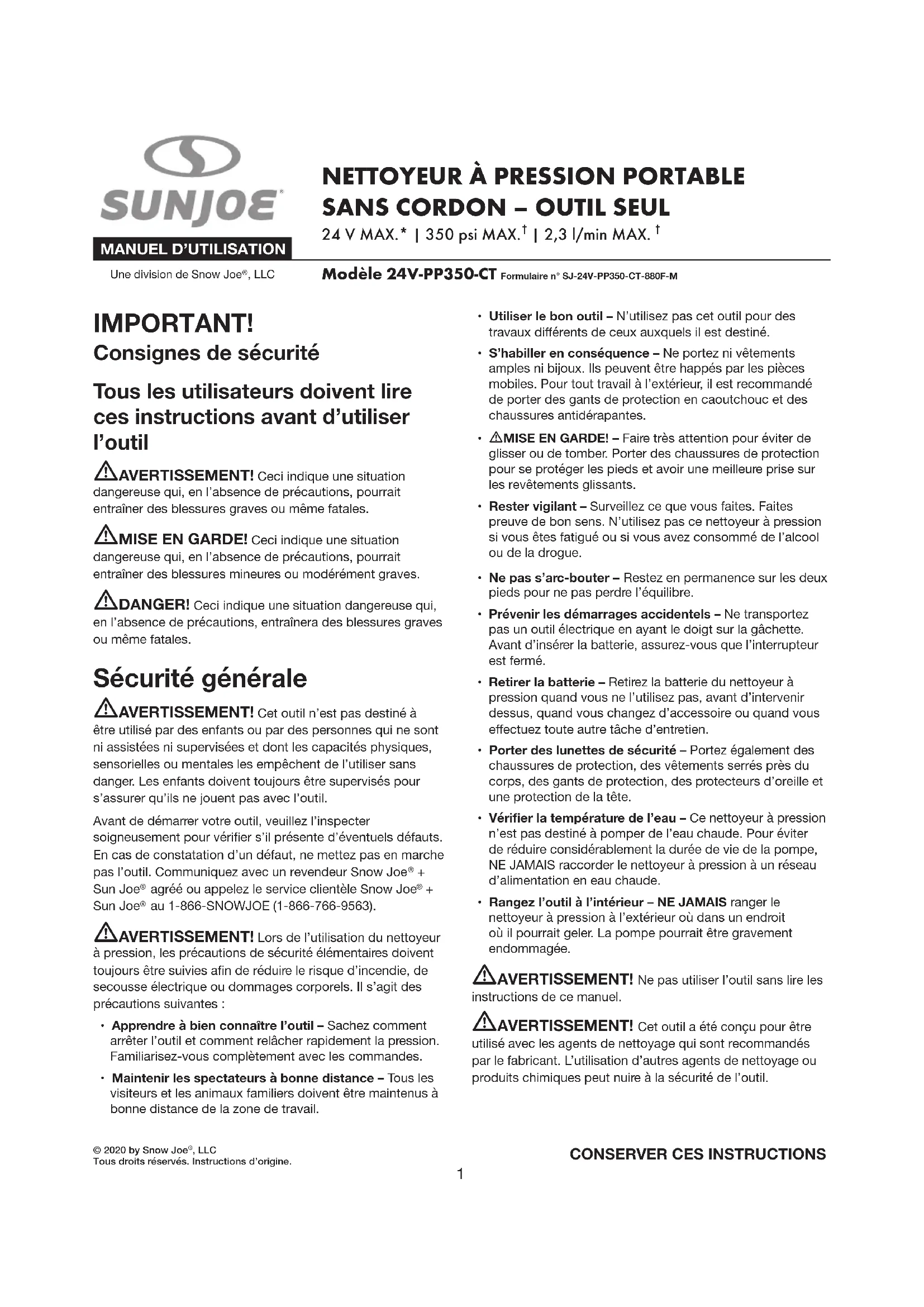 MODE D'EMPLOI 24VPP350CT Sun Joe