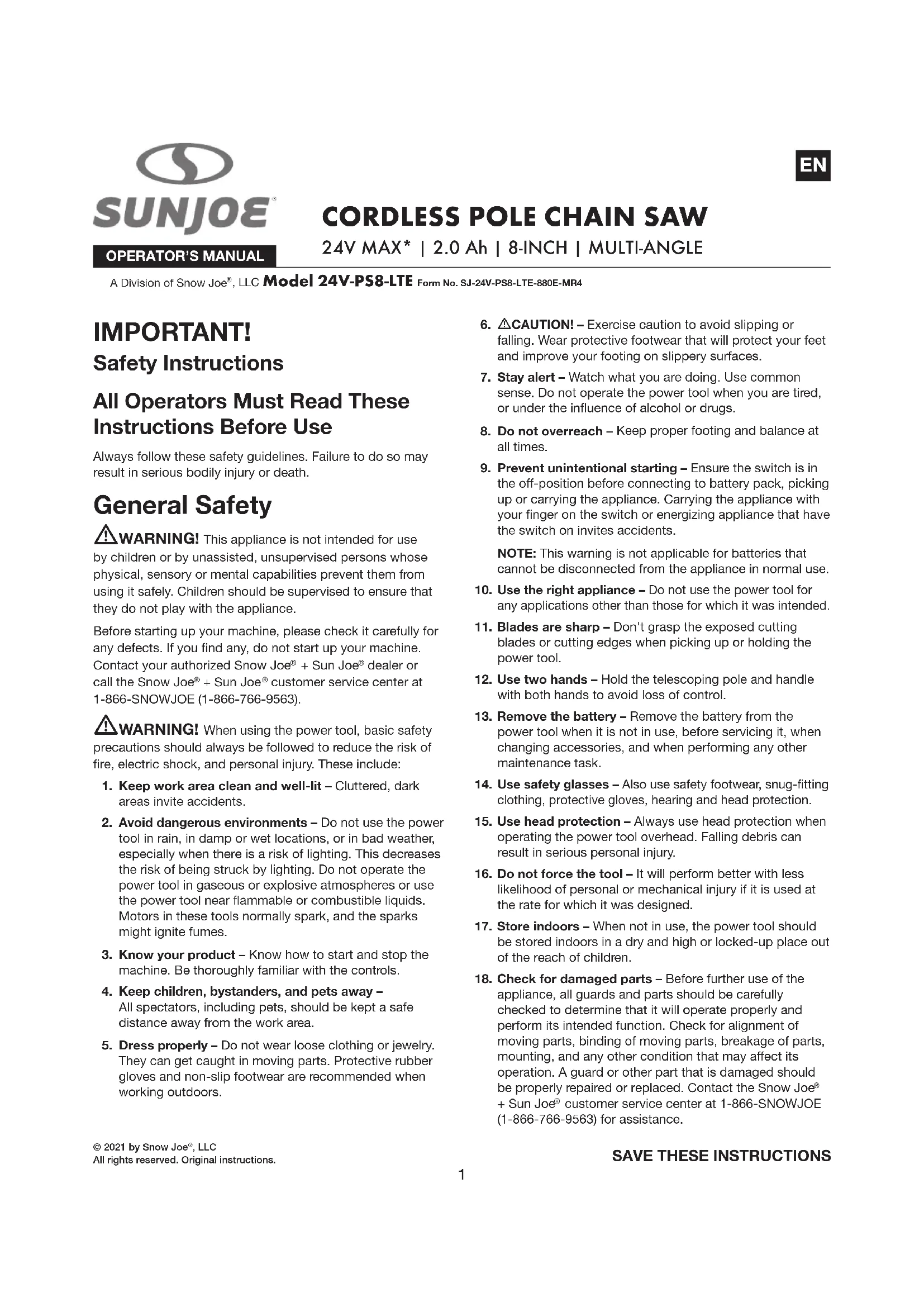 24VPS8LTE - Scie Sun Joe - Notice d'utilisation et mode d'emploi gratuit