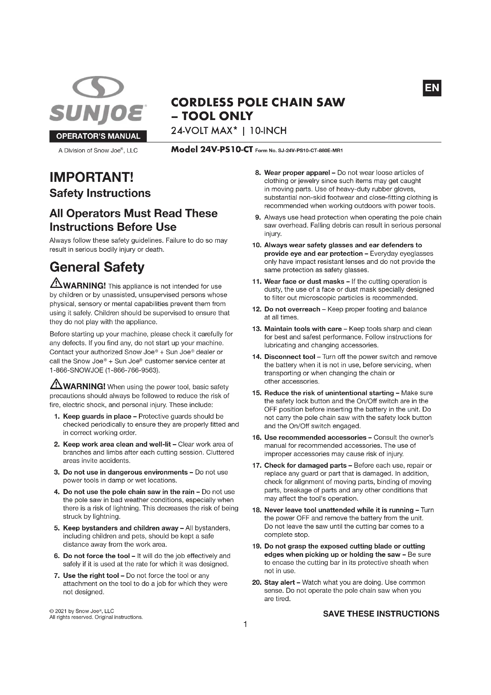 24VPS10CT - Scie Sun Joe - Notice d'utilisation et mode d'emploi gratuit