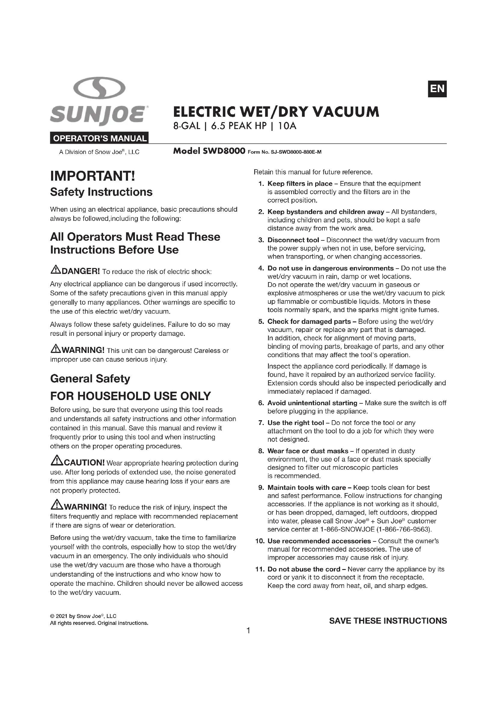 SWD8000 - Aspirateur Sun Joe - Notice d'utilisation et mode d'emploi gratuit