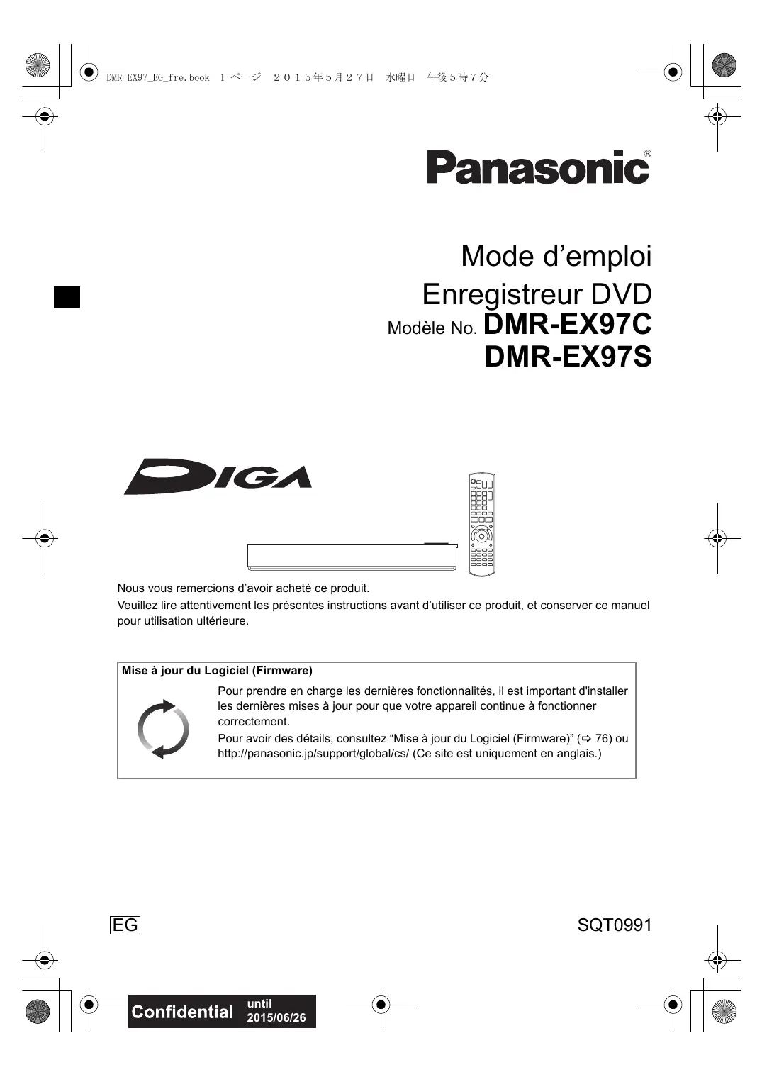 Mode d’emploi Enregistreur DVD Modèle No. DMR-EX97C DMR-EX97S Nous vous remercions d’avoir acheté ce produit. Veuillez lire attentivement les présentes instructions avant d’utiliser ce produit, et conserver ce manuel pour utilisation ultérieure. Mise à jour du Logiciel (Firmware) Pour prendre en charge les dernières fonctionnalités, il est important d'installer les dernières mises à jour pour que votre appareil continue à fonctionner correctement. Pour avoir des détails, consultez “Mise à jour du Logiciel (Firmware)” (> 76) ou http://panasonic.jp/support/global/cs/ (Ce site est uniquement en anglais.) SQT0991