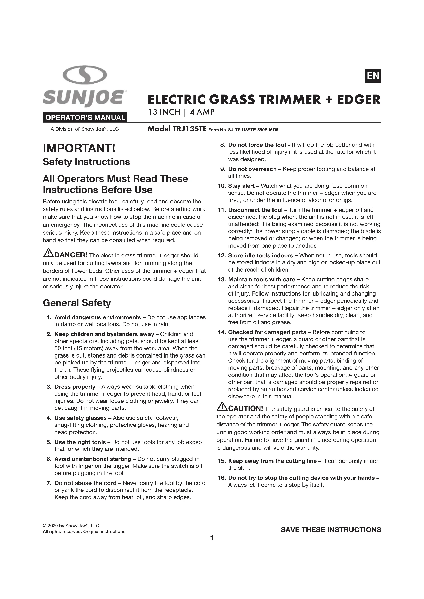 MODE D'EMPLOI TRJ13STE Sun Joe