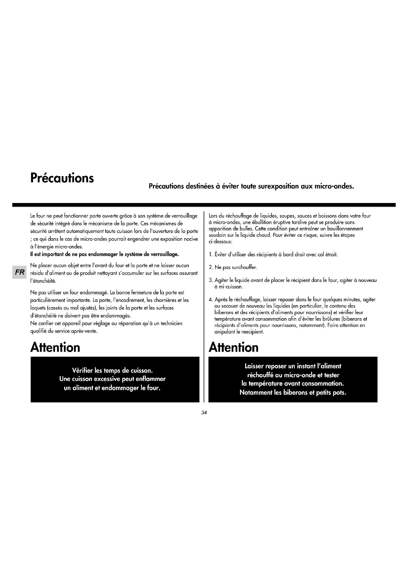 66~97 34~65 3~33Précautions destinées à éviter toute surexposition aux micro-ondes. Précautions Le four ne peut fonctionner porte ouverte grâce à son système de verrouillage de sécurité intégré dans le mécanisme de la porte. Ces mécanismes de sécurité arrêtent automatiquement toute cuisson lors de l’ouverture de la porte ; ce qui dans le cas de micro-ondes pourrait engendrer une exposition nocive à l’énergie micro-ondes. Il est important de ne pas endommager le système de verrouillage. Ne placer aucun objet entre l’avant du four et la porte et ne laisser aucun résidu d’aliment ou de produit nettoyant s’accumuler sur les surfaces assurant l’étanchéité. Ne pas utiliser un four endommagé. La bonne fermeture de la porte est particulièrement importante. La porte, l’encadrement, les charnières et les loquets (cassés ou mal ajustés), les joints de la porte et les surfaces d’étanchéité ne doivent pas être endommagés. Ne confier cet appareil pour réglage ou réparation qu’à un technicien qualifié du service après-vente. Attention Lors du réchauffage de liquides, soupes, sauces et boissons dans votre four à micro-ondes, une ébullition éruptive tardive peut se produire sans apparition de bulles. Cette condition peut entraîner un bouillonnenment soudain sur le liquide chaud. Pour éviter ce risque, suivre les étapes ci-dessous: