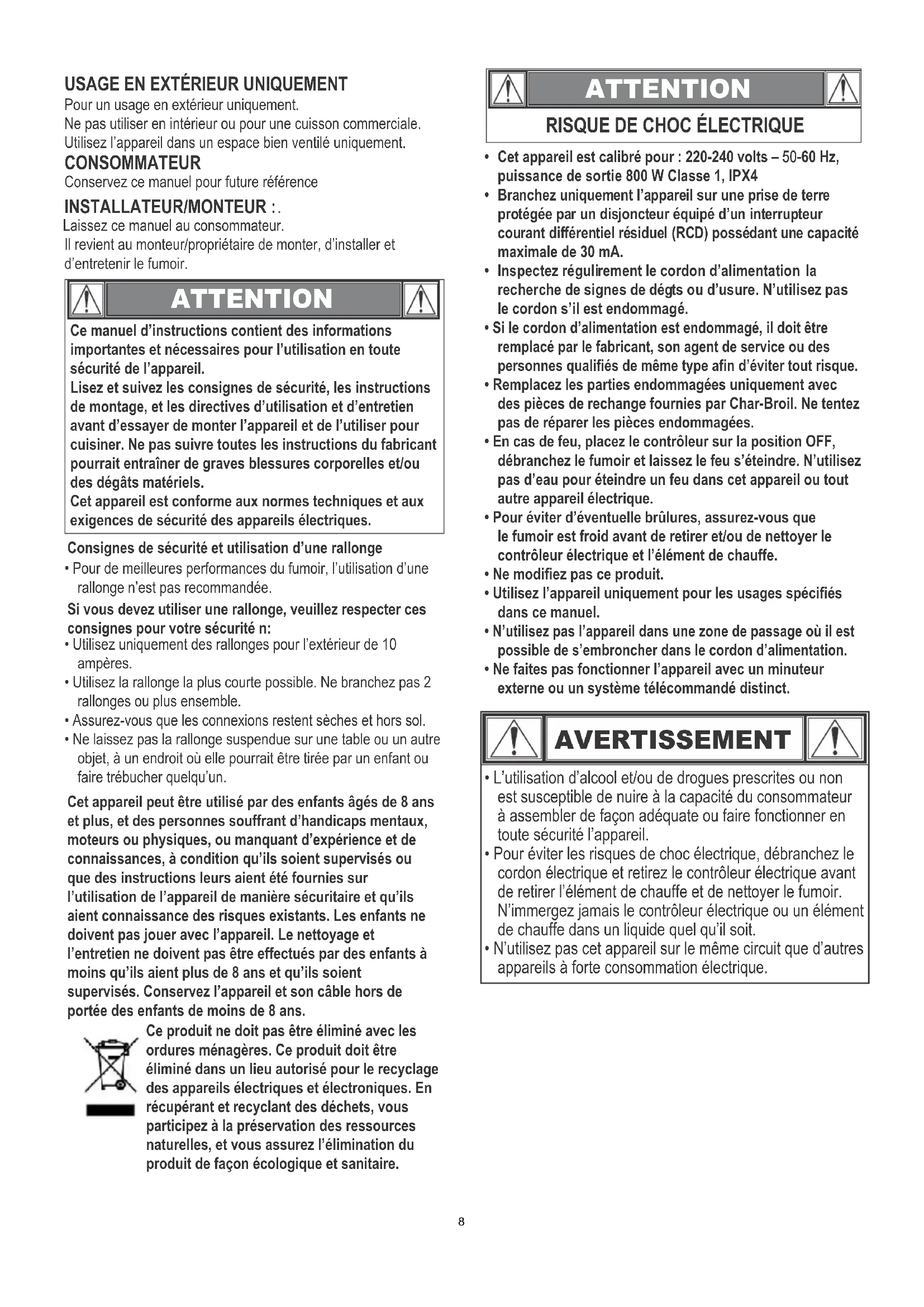 ATTENTION INSTALLATEUR/MONTEUR : Laissez ce manuel au consommateur.Il revient au monteur/propriétaire de monter, d’installer et d’entretenir le fumoir.Pour un usage en extérieur uniquement.Ne pas utiliser en intérieur ou pour une cuisson commerciale.Utilisez l’appareil dans un espace bien ventilé uniquement.Ce manuel d’instructions contient des informations importantes et nécessaires pour l’utilisation en toute sécurité de l’appareil.Lisez et suivez les consignes de sécurité, les instructions de montage, et les directives d’utilisation et d’entretien avant d’essayer de monter l’appareil et de l’utiliser pour cuisiner. Ne pas suivre toutes les instructions du fabricant pourrait entraîner de graves blessures corporelles et/ou des dégâts matériels.Cet appareil est conforme aux normes techniques et aux exigences de sécurité des appareils électriques.• Pour de meilleures performances du fumoir, l’utilisation d’unerallonge n’est pas recommandée.• Utilisez uniquement des rallonges pour l’extérieur de 10ampères.• Utilisez la rallonge la plus courte possible. Ne branchez pas 2rallonges ou plus ensemble.• Assurez-vous que les connexions restent sèches et hors sol.• Ne laissez pas la rallonge suspendue sur une table ou un autreobjet, à un endroit où elle pourrait être tirée par un enfant ou faire trébucher quelqu’un.