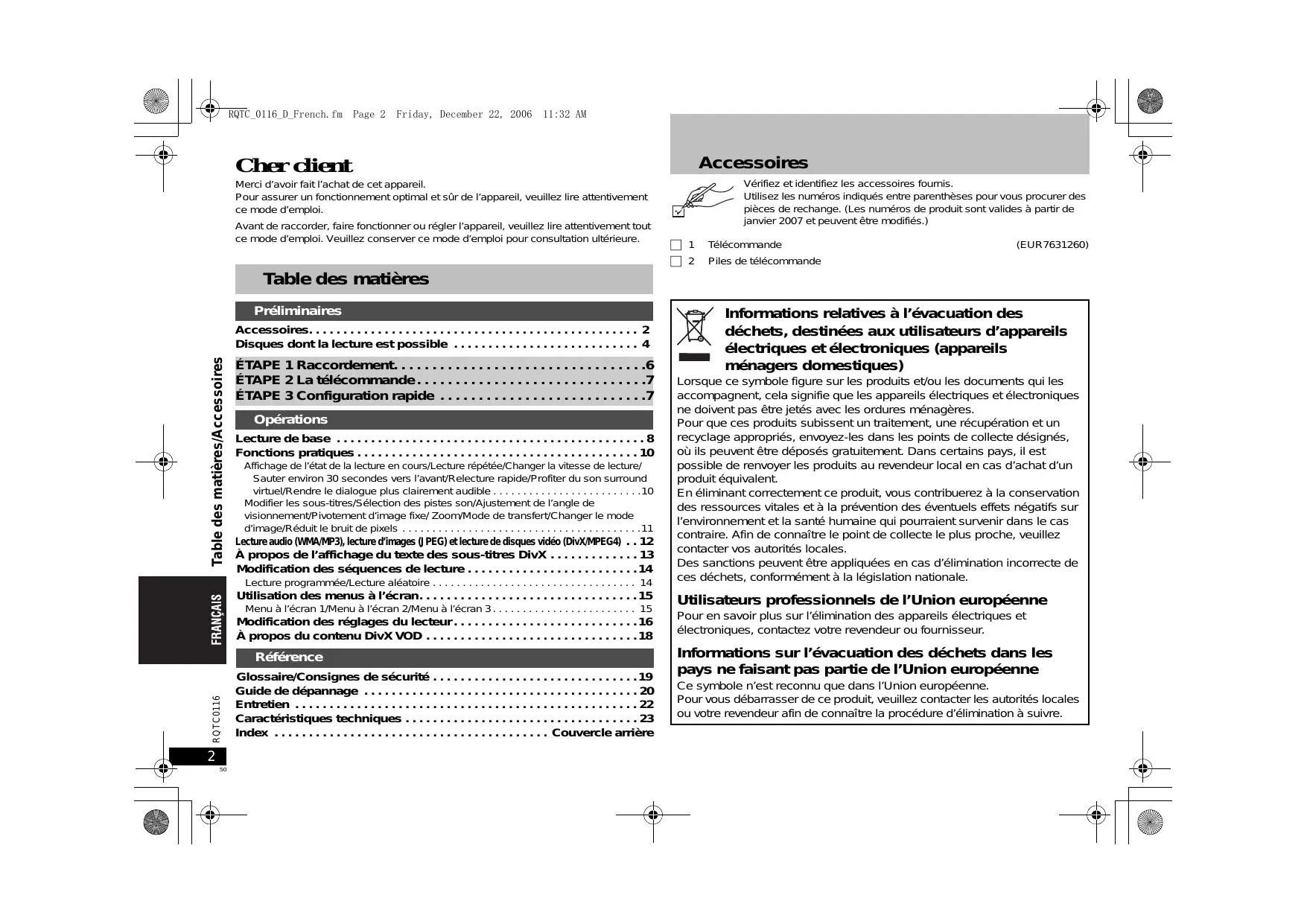 - RQTC_0116_D_French.fm Page 2 Friday, December 22, 2006 11:32 AM Accessoires Cher client Vérifiez et identifiez les accessoires fournis. Utilisez les numéros indiqués entre parenthèses pour vous procurer des pièces de rechange. (Les numéros de produit sont valides à partir de janvier 2007 et peuvent être modifiés.) Merci d’avoir fait l’achat de cet appareil. Pour assurer un fonctionnement optimal et sûr de l’appareil, veuillez lire attentivement ce mode d’emploi. Avant de raccorder, faire fonctionner ou régler l’appareil, veuillez lire attentivement tout ce mode d’emploi. Veuillez conserver ce mode d’emploi pour consultation ultérieure. ∏ 1 Télécommande ∏ 2 Piles de télécommande (EUR7631260) Table des matières Préliminaires Table des matières/Accessoires Accessoires p. 2