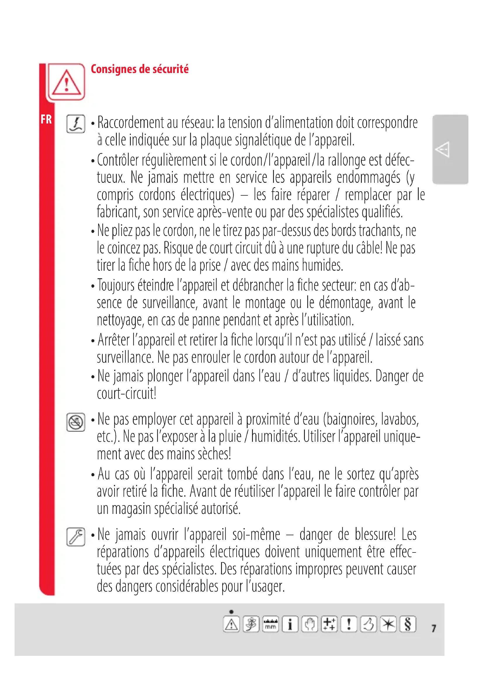 - Ne jamais ouvrir l’appareil soi-même – danger de blessure! Les réparations d’appareils électriques doivent uniquement être effec- tuées par des spécialistes. Des réparations impropres peuvent causer des dangers considérables pour l’usager.8 Consignes de sécurité
