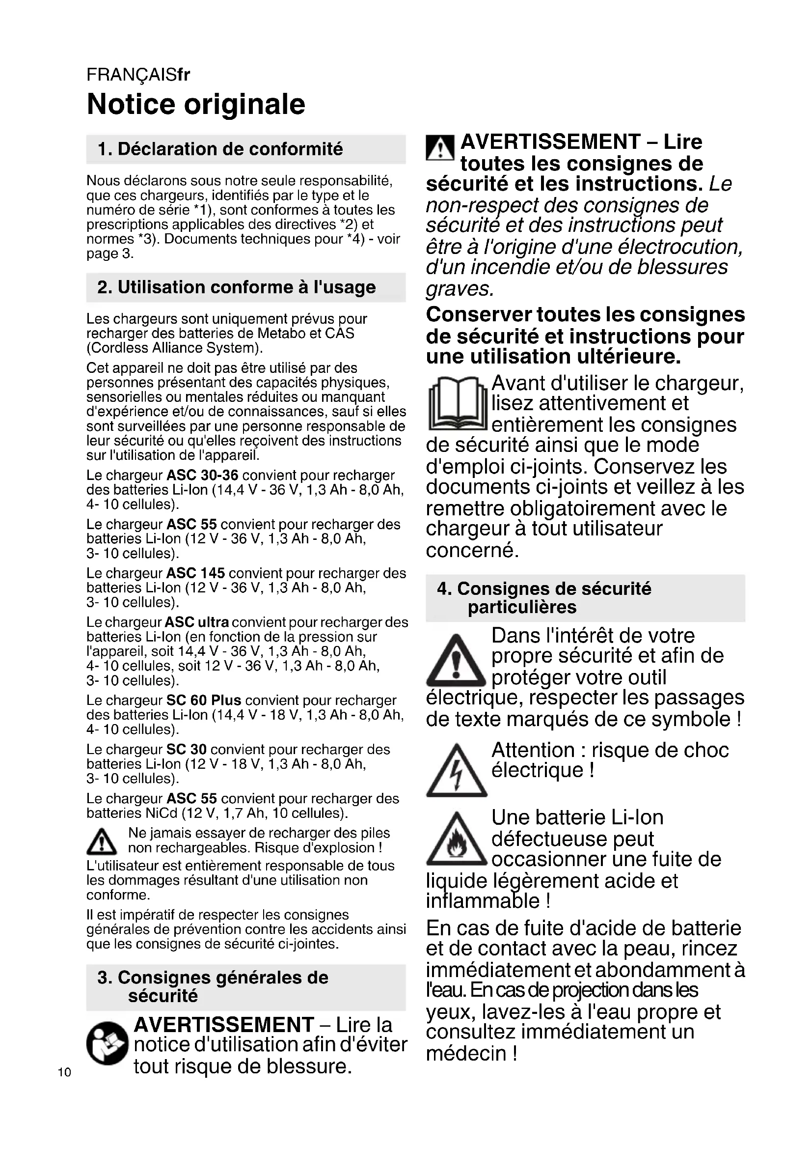 Notice originale Nous déclarons sous notre seule responsabilité, que ces chargeurs, identifiés par le type et le numéro de série *1), sont conformes à toutes les prescriptions applicables des directives *2) et normes *3). Documents techniques pour *4) - voir page 3. Les chargeurs sont uniquement prévus pour recharger des batteries de Metabo et CAS (Cordless Alliance System). Cet appareil ne doit pas être utilisé par des personnes présentant des capacités physiques, sensorielles ou mentales réduites ou manquant d'expérience et/ou de connaissances, sauf si elles sont surveillées par une personne responsable de leur sécurité ou qu'elles reçoivent des instructions sur l'utilisation de l'appareil. Le chargeur ASC 30-36 convient pour recharger des batteries Li-Ion (14,4 V - 36 V, 1,3 Ah - 8,0 Ah,