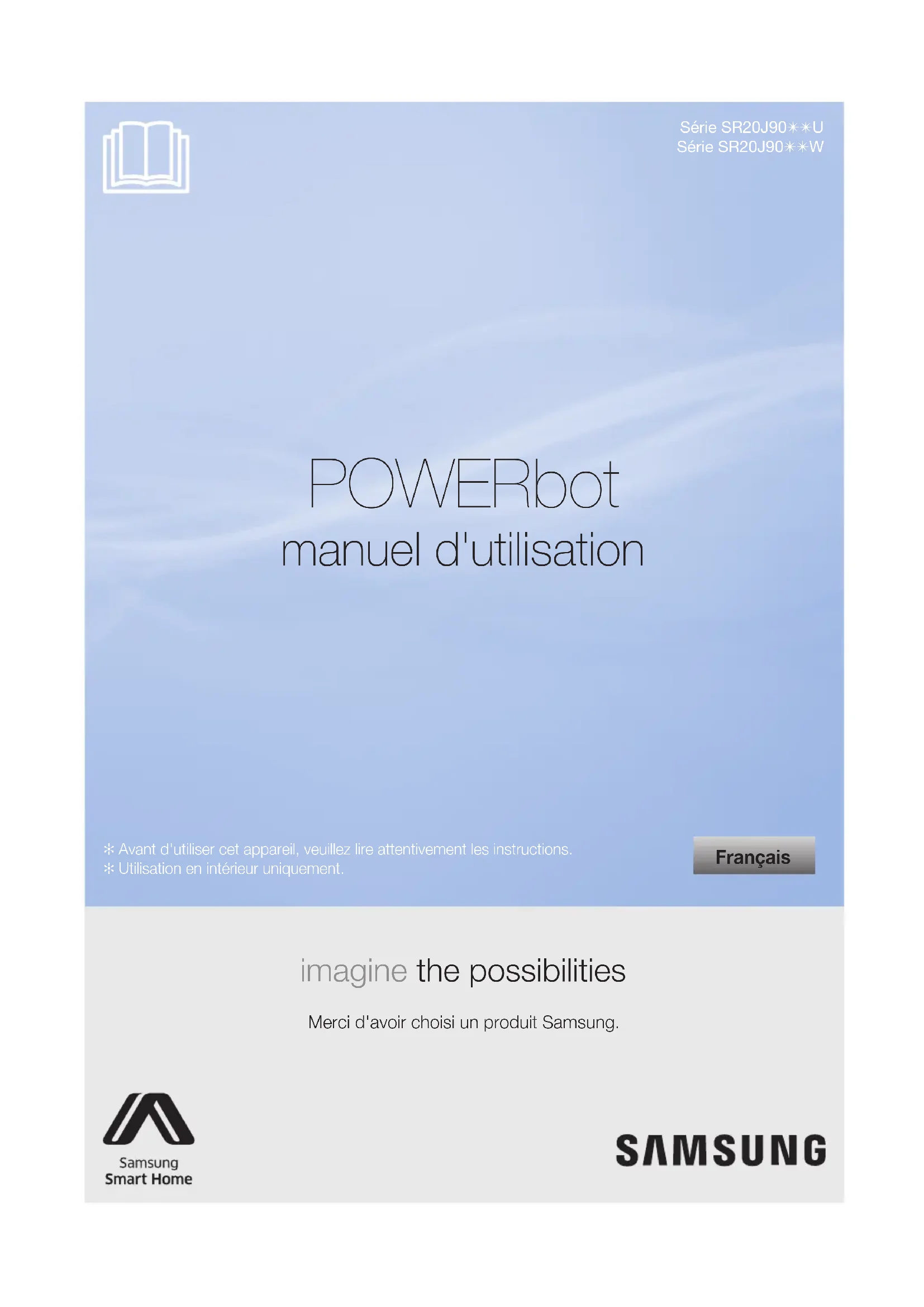 Série SR20J90✴✴USérie SR20J90✴✴W POWERbot manuel d'utilisation imagine the possibilities Merci d'avoir choisi un produit Samsung. Français ✻ Avant d'utiliser cet appareil, veuillez lire attentivement les instructions.✻ Utilisation en intérieur uniquement. SR20J90@@U_FR_00740J-01_FR.indd 1 2016-02-04 오전 11:35:35FRANÇAIS-02 Sommaire