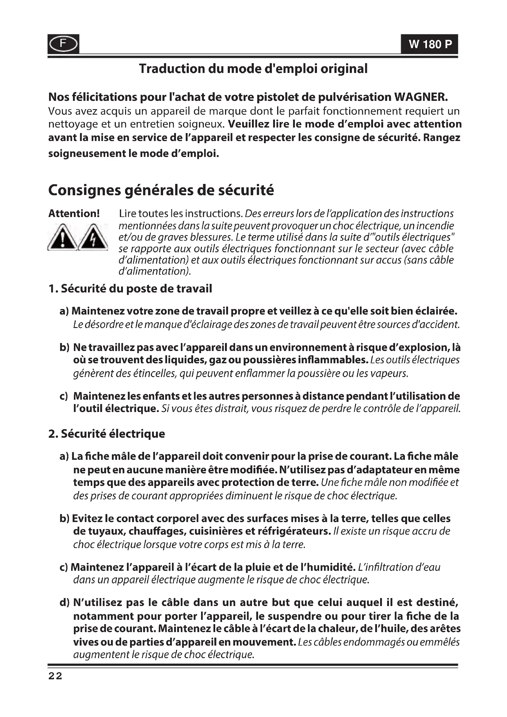 Traduction du mode d'emploi original Nos félicitations pour l'achat de votre pistolet de pulvérisation WAGNER. Vous avez acquis un appareil de marque dont le parfait fonctionnement requiert un nettoyage et un entretien soigneux. Veuillez lire le mode d’emploi avec attention avant la mise en service de l’appareil et respecter les consigne de sécurité. Rangez soigneusement le mode d’emploi. Consignes générales de sécurité Attention! Lire toutes les instructions. Des erreurs lors de l’application des instructions mentionnées dans la suite peuvent provoquer un choc électrique, un incendie et/ou de graves blessures. Le terme utilisé dans la suite d’"outils électriques" se rapporte aux outils électriques fonctionnant sur le secteur (avec câble d’alimentation) et aux outils électriques fonctionnant sur accus (sans câble d’alimentation).