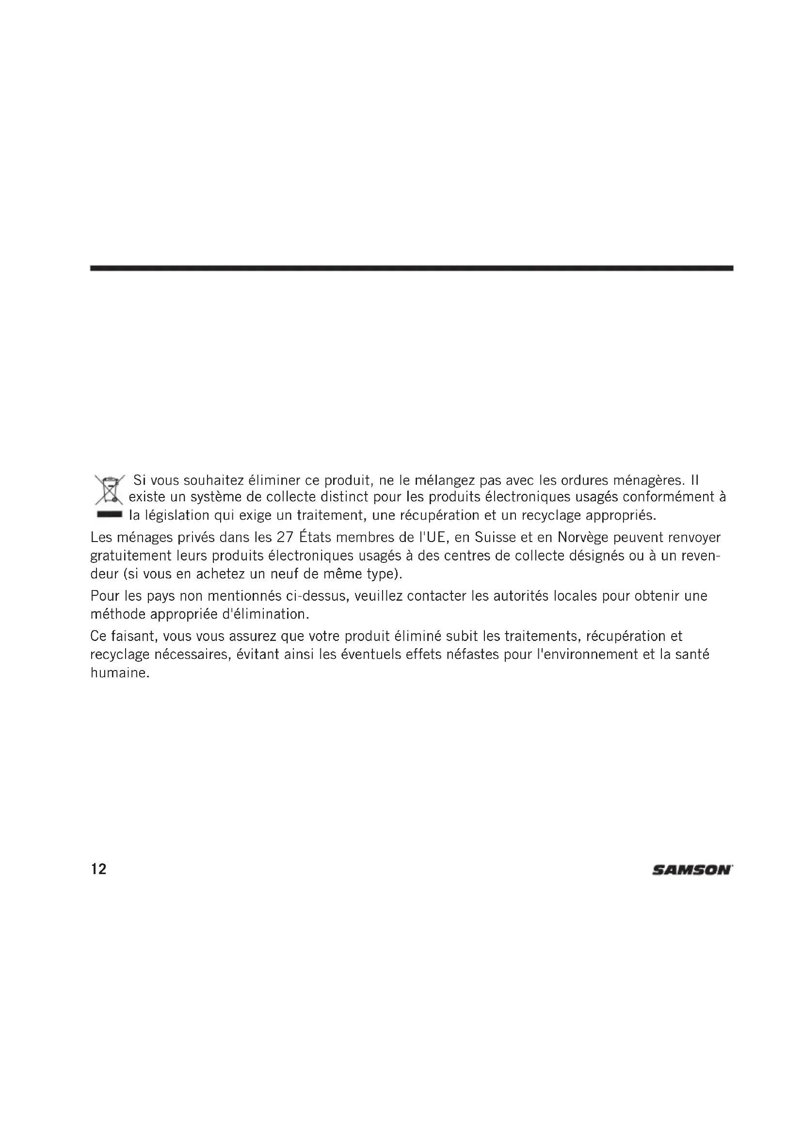 DE60x12 Si vous souhaitez éliminer ce produit, ne le mélangez pas avec les ordures ménagères. Il existe un système de collecte distinct pour les produits électroniques usagés conformément à la législation qui exige un traitement, une récupération et un recyclage appropriés. Les ménages privés dans les 27 États membres de l'UE, en Suisse et en Norvège peuvent renvoyer gratuitement leurs produits électroniques usagés à des centres de collecte désignés ou à un reven- deur (si vous en achetez un neuf de même type). Pour les pays non mentionnés ci-dessus, veuillez contacter les autorités locales pour obtenir une méthode appropriée d'élimination. Ce faisant, vous vous assurez que votre produit éliminé subit les traitements, récupération et recyclage nécessaires, évitant ainsi les éventuels effets néfastes pour l'environnement et la santé humaine.13Micro-casques DE10x/DE50x/DE60x ENFRDEESIT Nous vous félicitons d'avoir acheté le micro-casque Samson DEx. Les microcasques DE10x et DE50x ont une configuration de prise de son omnidirectionnelle qui offre une réponse en fréquence linéaire hors axe, ce qui permet d'obtenir un son clair et articulé, parfait pour les diffusions, les messes, les présentations, le théâtre et les classes de remise en forme. Le microcasque DE60x a une configuration de prise de son unidirectionnelle, qui offre une isolation impeccable, permettant d'obtenir plus de gain avant l’effet Larsen, et résultant en un son clair et distinct pour les sonorisations de directs. Le micro-casque DExest doté de quatre câbles d’adaptateur amovibles: 3,5 mm (1/8po), à 4 broches Hirose®, TA3F Switchcraft®, TA4F Switchcraft® pour une compatibilité avec les transmetteurs sans fil Samson ainsi que les transmetteurs les plus utilisés. Le pack comprend quatre bonnettes, une pince pour micro et une housse de transport. Les microphones DEx sont équipés de connecteurs plaqués or, d’un revêtement résistant à l'humidité et d’un maillage en acier inoxydable.Ils répondent à la norme IP65 pour leur résistance à la poussière et à l’humidité ou la transpiration. En outre, une bague de protection contre l’humidité permet de protéger davantage la capsule et de garantir des performances fiables. Si vous avez des questions ou des commentaires concernant le micro-casque DEx ou tout autre produit de Samson, n'hésitez pas à nous contacter par courriel à l’adresse support@samsontech.com. Introduction14 Le casque peut être ajusté en faisant glisser les crochets d'oreille pour qu’il épouse parfaitement à votre tête. Si le casque est lâche et ne reste pas en place, faites glisser les crochets d’oreille vers l'arrière pour un meilleur ajustement. Ajustez la position du microphone en tenant le câble du crochet de l'oreille gauche puis faites glisser le bras vers l'avant ou l'arrière. Pour une performance optimale, le microphone doit être près de la peau et vers le coin de la bouche, à environ 1,3cm de distance. Positionnez la bague de protection contre l'humidité au plus près de la capsule que possible. Pour une utilisation en plein air et pour aider à réduire les occlusives, installez l’une des bonnettes fournies. Réglage du micro-casque DE10x/50x/60x15Micro-casques DE10x/DE50x/DE60x ENFRDEESIT Câbles de branchement Les microcasques DE10x/DE50x/DE60x sont dotés de quatre câbles avec des adaptateurs pour certains des émetteurs de microphones sans fil les plus utilisés. Connecteur de 3,5 mm Fonctionne avec les systèmes sans fil Sennheiser