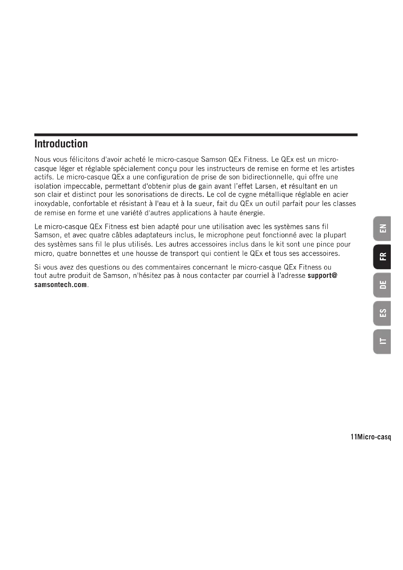 011Micro-casque QEx Fitness ENFRDEESIT Nous vous félicitons d'avoir acheté le micro-casque Samson QEx Fitness. Le QEx est un micro- casque léger et réglable spécialement conçu pour les instructeurs de remise en forme et les artistes actifs. Le micro-casque QEx a une configuration de prise de son bidirectionnelle, qui offre une isolation impeccable, permettant d'obtenir plus de gain avant l’effet Larsen, et résultant en un son clair et distinct pour les sonorisations de directs. Le col de cygne métallique réglable en acier inoxydable, confortable et résistant à l'eau et à la sueur, fait du QEx un outil parfait pour les classes de remise en forme et une variété d'autres applications à haute énergie. Le micro-casque QEx Fitness est bien adapté pour une utilisation avec les systèmes sans fil Samson, et avec quatre câbles adaptateurs inclus, le microphone peut fonctionné avec la plupart des systèmes sans fil le plus utilisés. Les autres accessoires inclus dans le kit sont une pince pour micro, quatre bonnettes et une housse de transport qui contient le QEx et tous ses accessoires. Si vous avez des questions ou des commentaires concernant le micro-casque QEx Fitness ou tout autre produit de Samson, n'hésitez pas à nous contacter par courriel à l’adresse support@ samsontech.com. Introduction12 Pour plus de confort et un meilleur ajustement, le casque QEx comprend un serre-tête réglable. Pour ajuster le serre-tête, tirez la sangle élastique sur les crochets d'oreille puis placez-la devant le point d'arrêt (A). Pour des tailles plus importantes, le serre-tête peut être déplacé derrière le point d'arrêt (B) ou complètement retiré en faisant glisser la bande élastique sur les crochets d'oreille et la capsule du microphone. Remarque: enlevez d'abord la bonnette du microphone lorsque vous retirez le serre-tête. Réglage du micro-casque QEx13Micro-casque QEx Fitness ENFRDEESIT Câbles de branchement Le micro-casque QEx est doté de quatre câbles avec des adaptateurs pour certains des émetteurs de microphones sans fil en ceinture les plus utilisés. Connecteur de 3,5 mm Fonctionne avec les systèmes sans fil Sennheiser