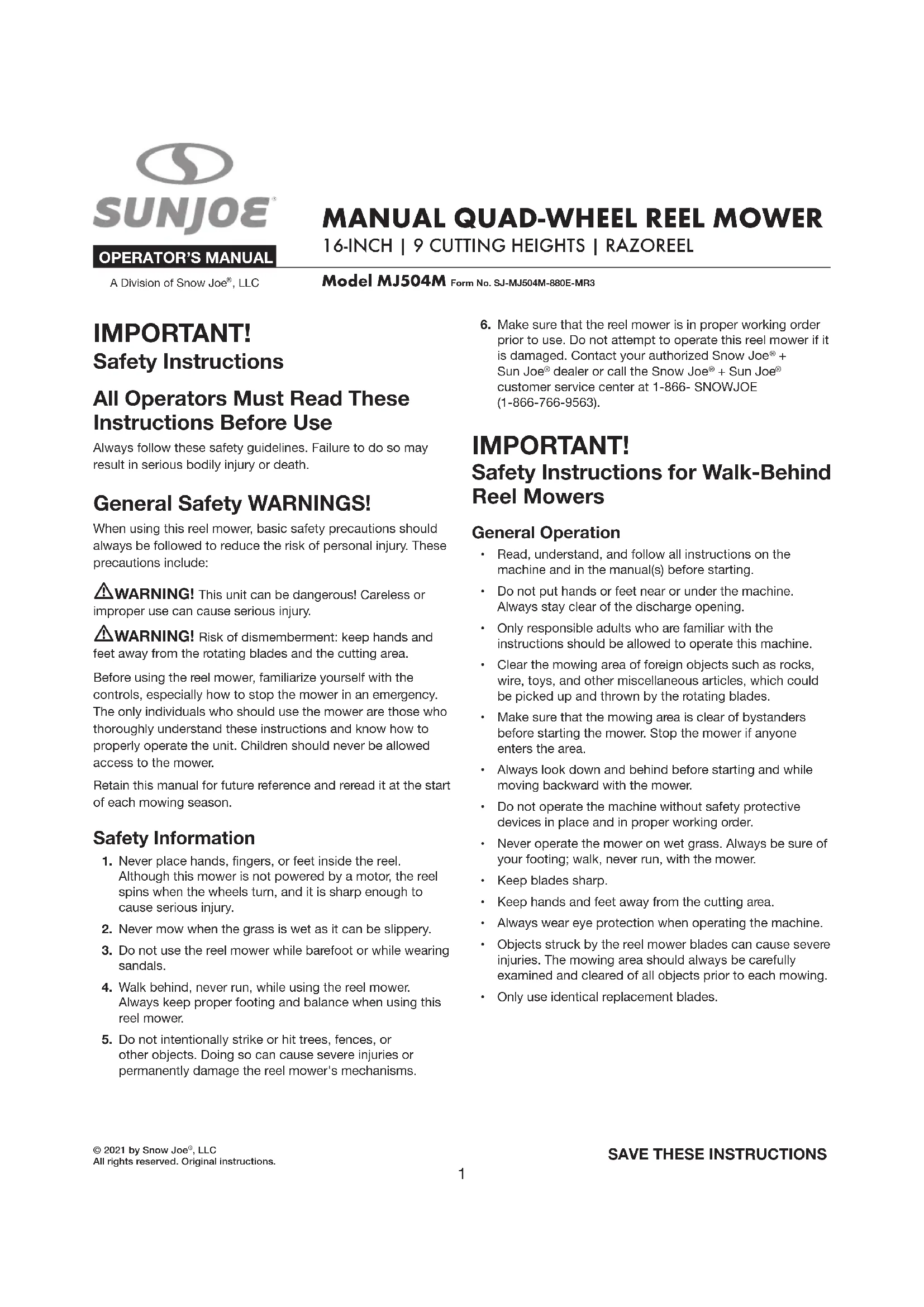 au 1-866-SNOWJOE (1-866-766-9563). IMPORTANT! Consignes de sécurité pour les tondeuses à rouleau poussées Généralités concernant l'utilisation