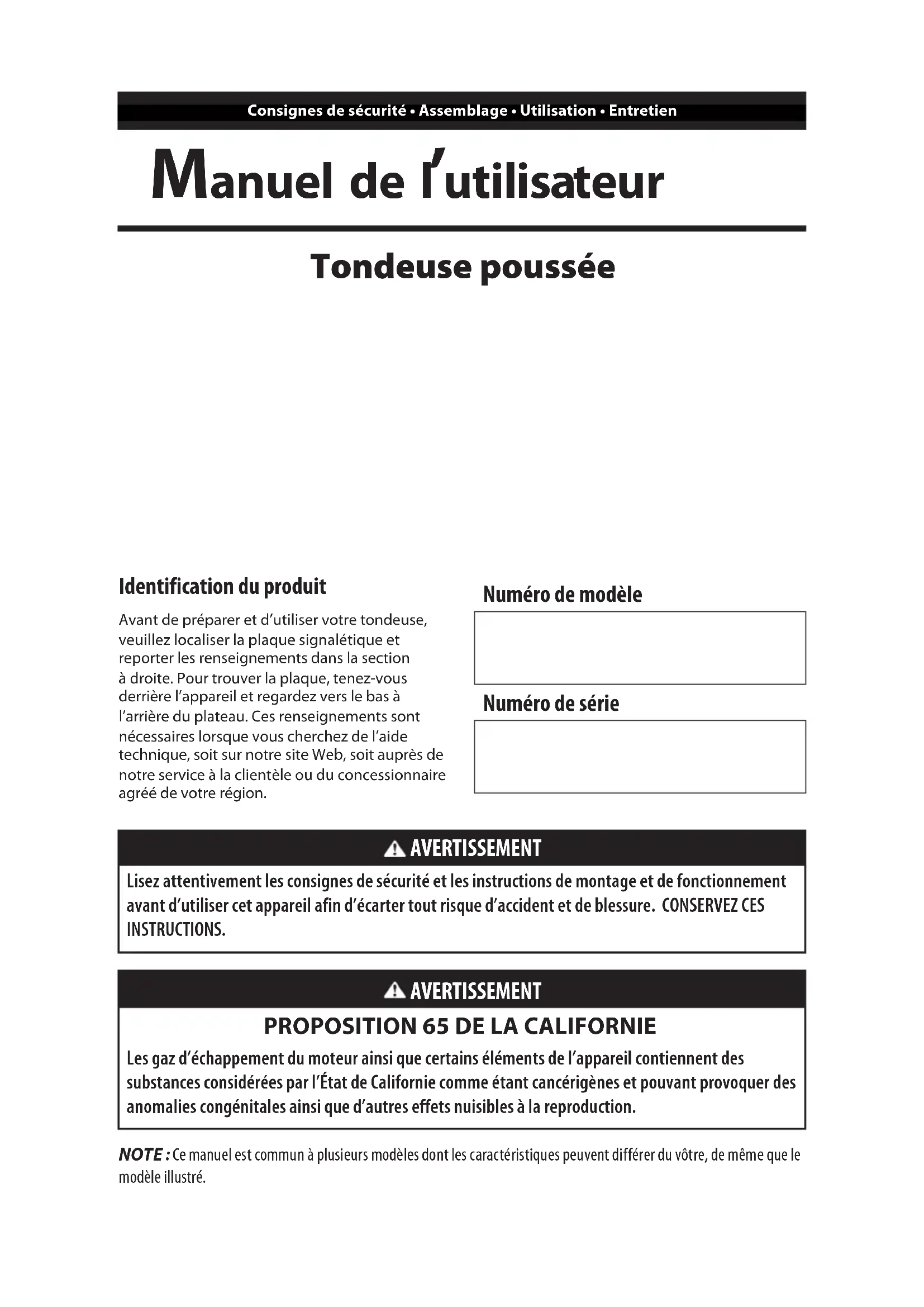 Les gaz d’échappement du moteur ainsi que certains éléments de l’appareil contiennent des substances considérées par l’État de Californie comme étant cancérigènes et pouvant provoquer des anomalies congénitales ainsi que d’autres effets nuisibles à la reproduction. Identification du produit Avant de préparer et d’utiliser votre tondeuse, veuillez localiser la plaque signalétique et reporter les renseignements dans la section à droite. Pour trouver la plaque, tenez-vous derrière l’appareil et regardez vers le bas à l’arrière du plateau. Ces renseignements sont nécessaires lorsque vous cherchez de l’aide technique, soit sur notre site Web, soit auprès de notre service à la clientèle ou du concessionnaire agréé de votre région. Numéro de modèle Numéro de série33