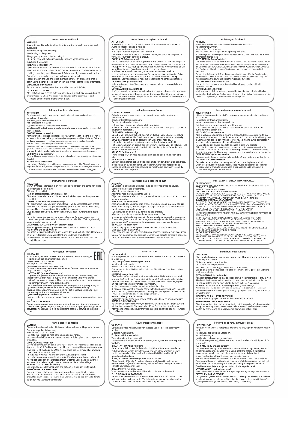 Instructions pour la planche de surf ATTENTION À n’utiliser qu’en eau où l’enfant a pied et sous la surveillance d’un adulte. Aucune protection contre la noyade. Ne pas se mettre debout sur le jeu. Empoignez toujours le jeu pendant l’utilisation. Les objets pointus et rugueux comme les pierres, le ciment, les coquilles, le verre, etc. pourraient perforer le produit. GONFLAGE (si nécessaire) Ouvrez la soupape de sécurité et gonflez le jeu. Gonflez la chambre jusqu’à ce qu’elle soit rigide au toucher, mais pas dure. Insérez le bouchon d’arrêt dans la soupape et enfoncez-la en appuyant fermement dessus. Ne surgonflez jamais ou n’utilisez jamais d’air à haute pression pour le gonflage. N’utilisez pas le jeu si vous soupçonnez une crevaison ou une fuite. Un bon gonflage et un bon usage sont fondamentaux pour la sécurité. Faites bien attention que la soupape de sécurité soit bien fermée avant chaque utilisation. Contrôlez régulièrement que les coutures ne sont pas déchirées. DÉGONFLAGE (si nécessaire) Retirez le bouchon d’arrêt et pressez la soupape à la base jusqu’à la fin du dégonflage.