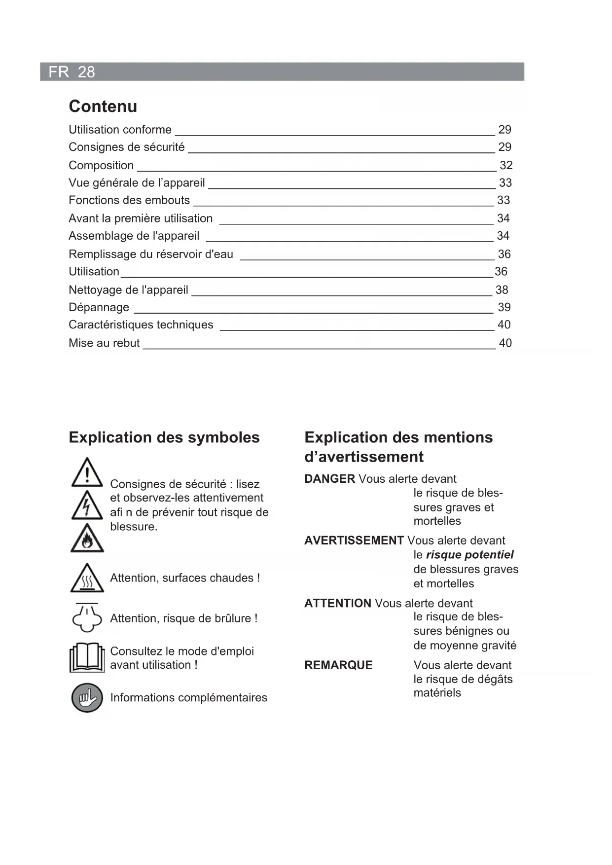 - Tout défaut imputable à une utilisation non conforme, à des endommagements, un entartrage ou à des tentatives de réparation est exclu de la garantie. L'usure nor- male des pièces est également exclue de la garantie. Consignes de sécurité ■ Cet appareil peut être utilisé par les personnes dont les capaci- tés physiques, sensorielles ou mentales sont réduites ou man- quant d’expérience et/ou de connaissances lorsqu'elles sont sous surveillance ou qu’elles ont été instruites quant à l'utilisa- tion sécurisée de l'appareil et qu'elles ont compris les risques en découlant. Les enfants ne doivent pas jouer avec l'appareil. ■ Lorsque l'appareil est enclenché ou qu'il est en phase de refroi- dissement, il doit être tenu hors de portée des enfants. ■ L'appareil doit être utilisé et rangé uniquement hors de portée des enfants et des animaux. Une utilisation impropre de l'appa- reil risque de causer des blessures, des brûlures ou des élec- trocutions. Chère cliente, cher client, Nous vous félicitons d'avoir fait l'acquisition de notre nettoyeur vapeur. Veuillez lire attentivement le présent mode d'emploi avant la première utilisation de l’appareil et conservez-le précieusement pour toute question ultérieure ainsi que pour les autres utilisateurs. Veuillez également respecter les indications sur l'appareil. Pour toute question concernant l'appareil et ses pièces de rechange et acces- soires, vous pouvez contacter le service après-vente à partir de notre site Internet : www.service-shopping.deFR 30 ■ La fi che de l'appareil doit toujours être débranchée du secteur lorsque l'appareil n'est pas sous surveillance, avant qu'il soit as- semblé, démonté ou nettoyé ou encore quand il s’agit de remplir ou vider son réservoir d'eau. ■ ATTENTION – Surface chaude ! Durant son utilisation, il faut tenir l'appareil uniquement par sa poignée. Immé- diatement après l’utilisation, des parties de l'appareil peuvent encore être très chaudes. Laissez-les d'abord toujours refroidir avant de les toucher. ■ Pendant l'utilisation, l'orifi ce de remplissage du réservoir d'eau ne doit pas être ouvert. Avant l'utilisation, assurez-vous toujours que le réservoir d'eau est correctement fermé. ■ Le liquide ou la vapeur ne doivent pas être directement orientés vers des appareils et des dispositifs électriques contenant des composants électriques, comme par ex. l'intérieur de fours. ■ L'appareil ne doit pas être utilisé s'il est tombé, s'il présente des dommages apparents ou qu'il fuit. ■ Ne procédez à aucune modifi cation sur l’appareil. Afi n d'éviter tout danger, un appareil, un cordon d'alimentation et une fi che endommagés doivent être remplacés par le fabricant, le service après-vente ou un atelier spécialisé. DANGER – Risque d'électrocution au contact de l'eau ! ■ Utilisez et entreposez l'appareil uniquement dans des pièces fermées. ■ N’utilisez pas l'appareil dans des pièces à fort taux d'humidité. ■ Ne plongez jamais l'appareil, le cordon d’alimentation ou la fi che dans l'eau ou dans tout autre liquide. Assurez-vous que l'appareil, le cordon et la fi che d'alimentation ne risquent pas de tomber dans l'eau ou d'être mouillés. ■ Si l'appareil devait tomber à l'eau, coupez immédiatement l'alimentation électrique. N'essayez pas d'extraire l'appareil de l'eau tant qu'il est encore raccordé au réseau électrique ! ■ Ne saisissez jamais l'appareil, le cordon d'alimentation et la fi che secteur à mains humides lorsque ces composants sont raccordés au réseau électrique. AVERTISSEMENT – Risque d'électrocution par suite d'un endommagement et d'une utilisation inadéquate ! ■ Branchez l'appareil uniquement sur une prise de courant correctement installée et mise à la terre, et de plus correspondant à les données sur la plaque signalétique de l'appareil. La prise doit rester facilement accessible même après le branchement de telle sorte à pouvoir rapidement couper l'alimentation de l'appareil.31 FR ■ Utilisez uniquement des rallonges réglementaires dont les caractéristiques tech- niques correspondent à les données sur la plaque signalétique de l'appareil. ■ Avant de retirer la fi che de la prise de courant, ou de la brancher, veillez à ce que l'interrupteur de l'appareil se trouve en position d'arrêt. ■ En cas d'orage, d'endommagement ou d'anomalie quelconque (par ex. bruits inso- lites, dégagement d'odeur suspecte ou de fumée), arrêtez immédiatement l'appareil et retirez la fi che de la prise. Faites vérifi er l'appareil par une personne qualifi ée avant de le réutiliser. AVERTISSEMENT – Risque de brûlure par suite de la vapeur brû- lante ! ■ Cet appareil fonctionne à la vapeur brûlante. N'orientez jamais la vapeur vers des personnes, des animaux ou des plantes ! ■ Respectez une distance d'au moins 30 cm par rapport aux parties de l'appareil dégageant de la vapeur. ■ Portez des chaussures fermées pour le nettoyage à la vapeur des sols. AVERTISSEMENT – Risque de blessures ! ■ Risque de strangulation ! Assurez-vous de toujours tenir le cordon d'alimentation hors de portée des jeunes enfants et des animaux. ■ Risque de chute ! Afi n que personne ne risque de trébucher, veillez à ce que le cordon d'alimentation branché ne gêne pas le passage. AVERTISSEMENT – Risque d'incendie ! ■ N'utilisez pas l'appareil dans des locaux renfermant des substances facilement in- fl ammables ou des vapeurs nocives ou explosives. ■ L'appareil ne doit pas être utilisé à proximité de matériaux facilement infl ammables. ■ Afi n d'éviter tout risque d'incendie de l'appareil, ne le couvrez pas lorsqu'il est en cours de fonctionnement. N'introduisez aucun objet dans les orifi ces de l'appareil et assurez-vous que ces derniers ne sont pas obstrués. ■ Ne branchez pas l'appareil avec d'autres consommateurs (puissants) sur une multi- prise afi n d'évite