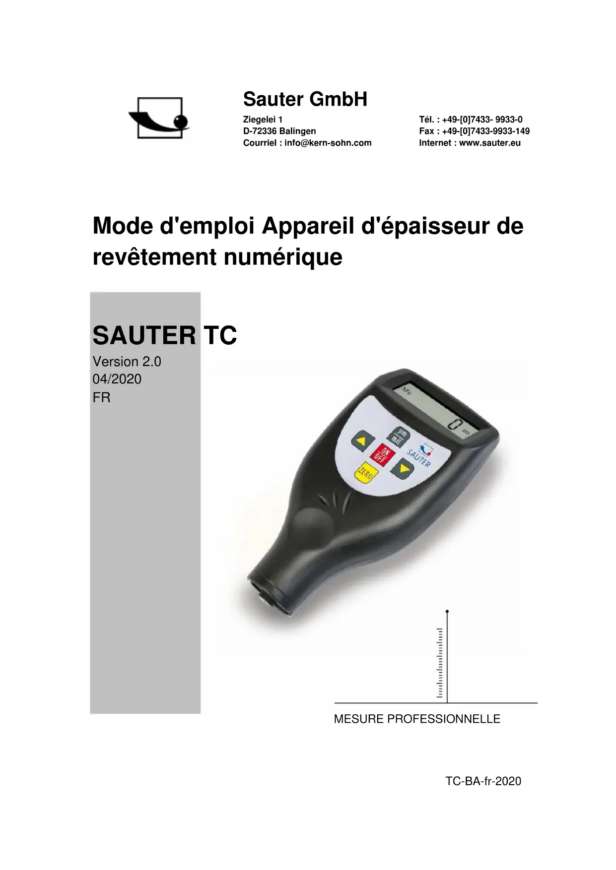 Nous vous remercions d'avoir acheté une jauge d'épaisseur de revêtement numérique de SAUTER. Nous espérons que vous serez très satisfait de la haute qualité de cet appareil de mesure et de ses nombreuses fonctionnalités. Nous sommes à votre disposition pour toute question, tout souhait et toute suggestion. Table des matières: