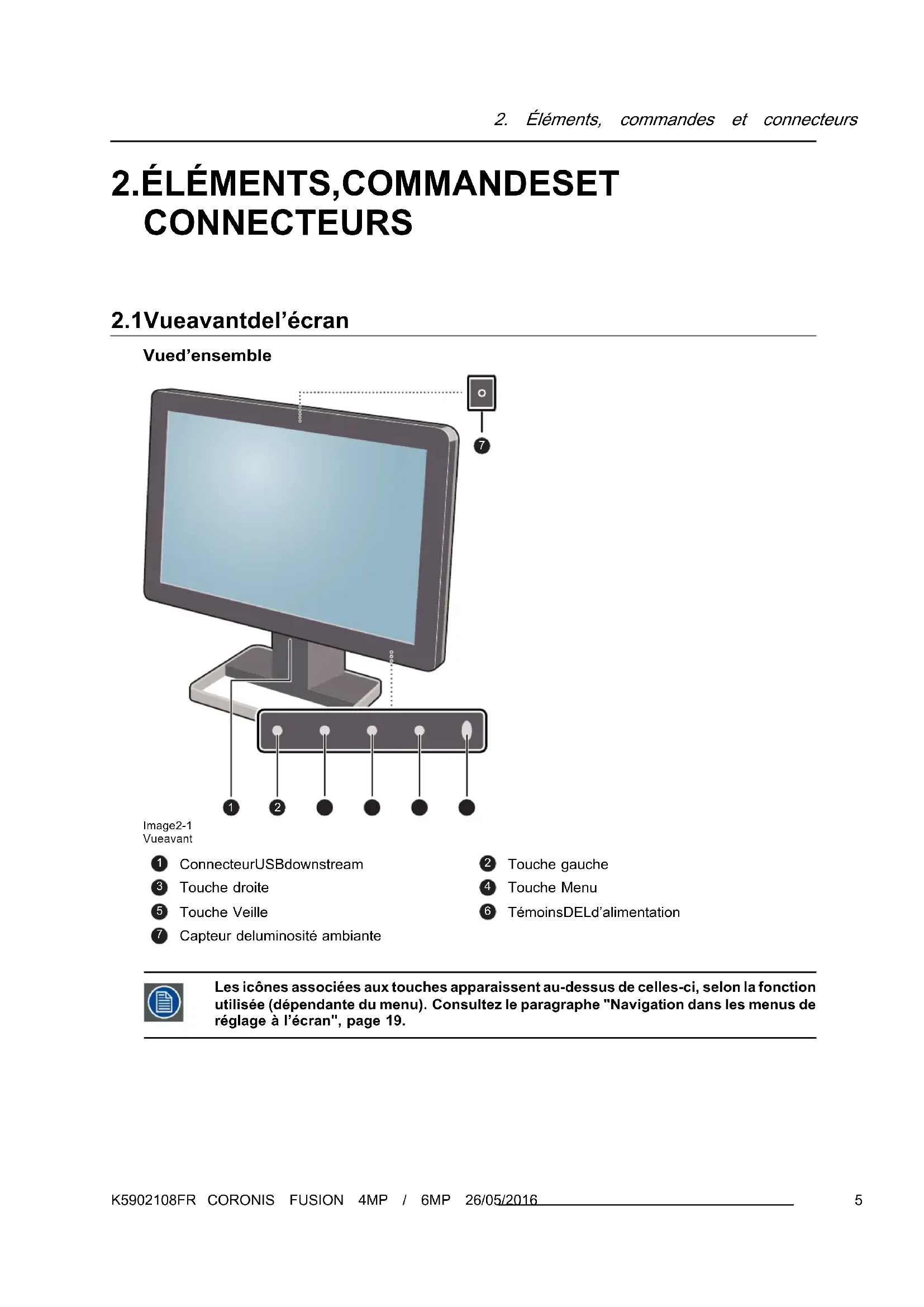- une source d’alimentation externe Si vous avez commandé une carte graphique Barco, elle se trouve également dans la boîte avec ses accessoires. Un manuel utilisateur dédié figure sur le CD de documentation. Conservez l’emballage d’origine. Il est conçu pour cet écran et constitue sa protection idéale pendant l e transport et pour s on stockage. K5902108FR CORONIS FUSION 4MP / 6MP 26/05/2016 31. Bienvenue ! 4 K5902108FR CORONIS FUSION 4MP / 6MP 26/05/20162. Éléments, commandes et connecteurs